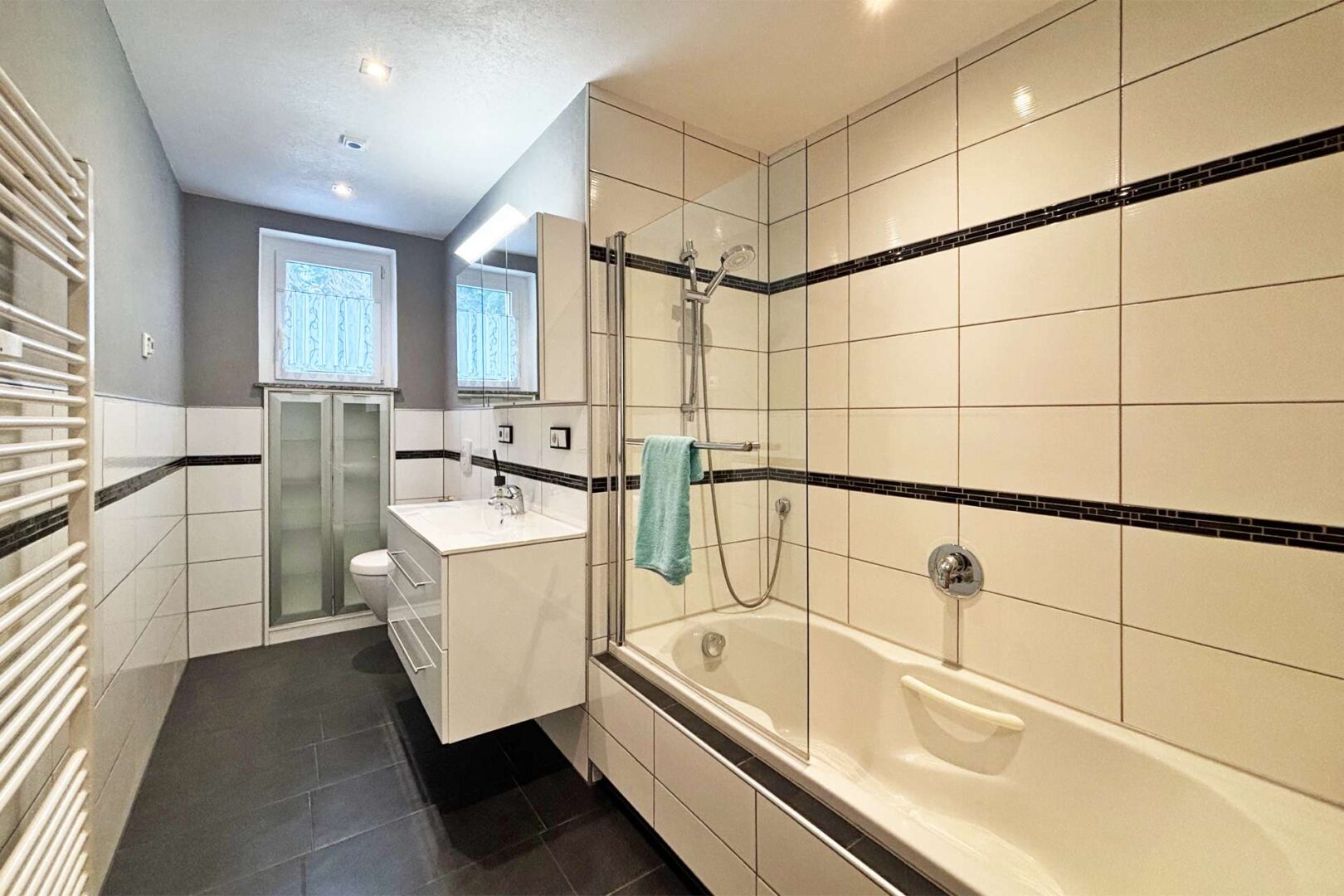 Vom Wohnbereich aus führt ein Flur in den privateren Teil der Wohnung. Gleich links befindet sich das erste Zimmer, welches sich mit etwa 9 m² Wohnfläche hervorragend als Kinderzimmer, Ankleide oder Büro eignet. Gegenüber liegt ein weiteres Zimmer mit ca. 12 m². Das erste Tageslichtbad ist mit einer Duschwanne, einem WC und einem praktischen Einbauschrank ausgestattet.