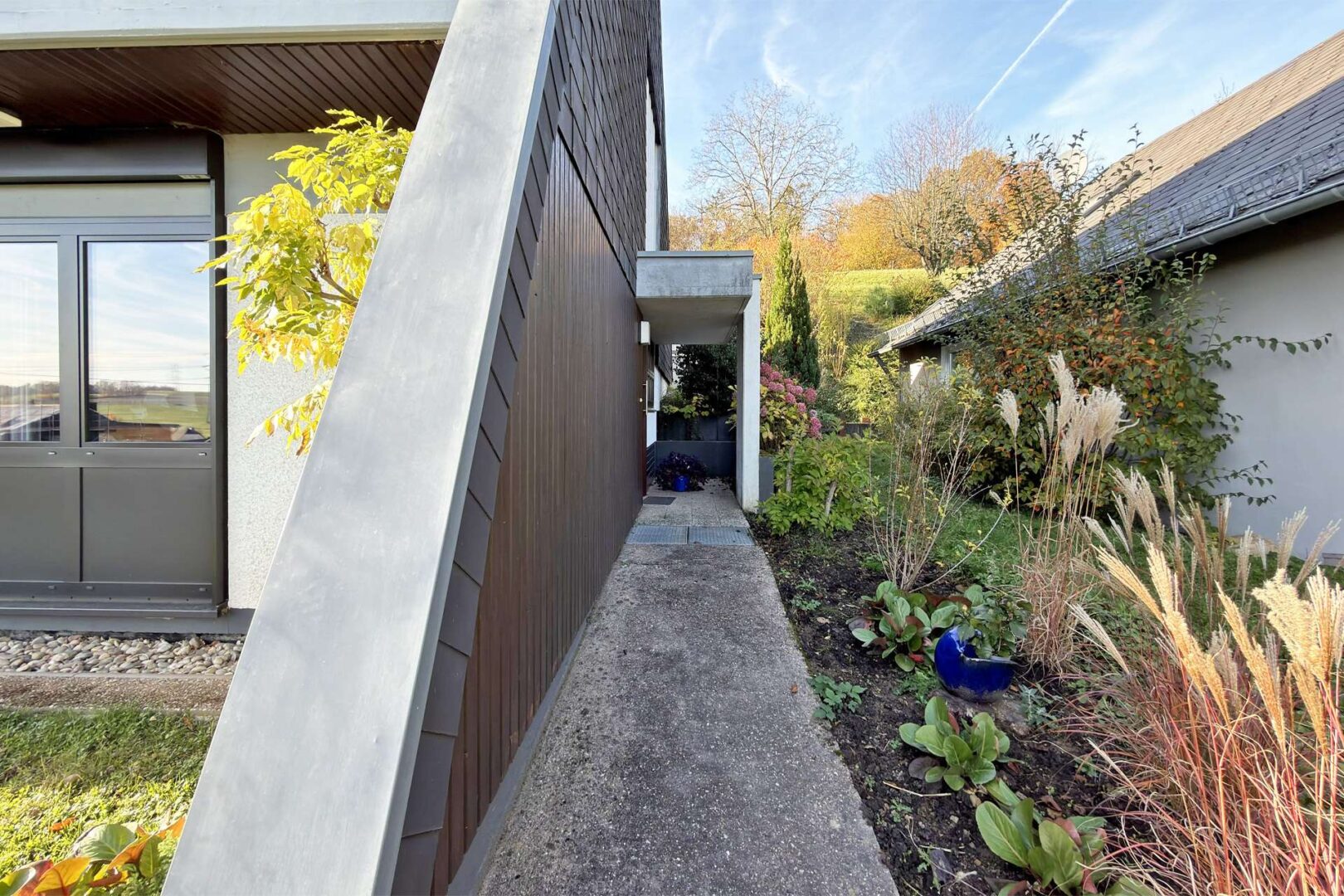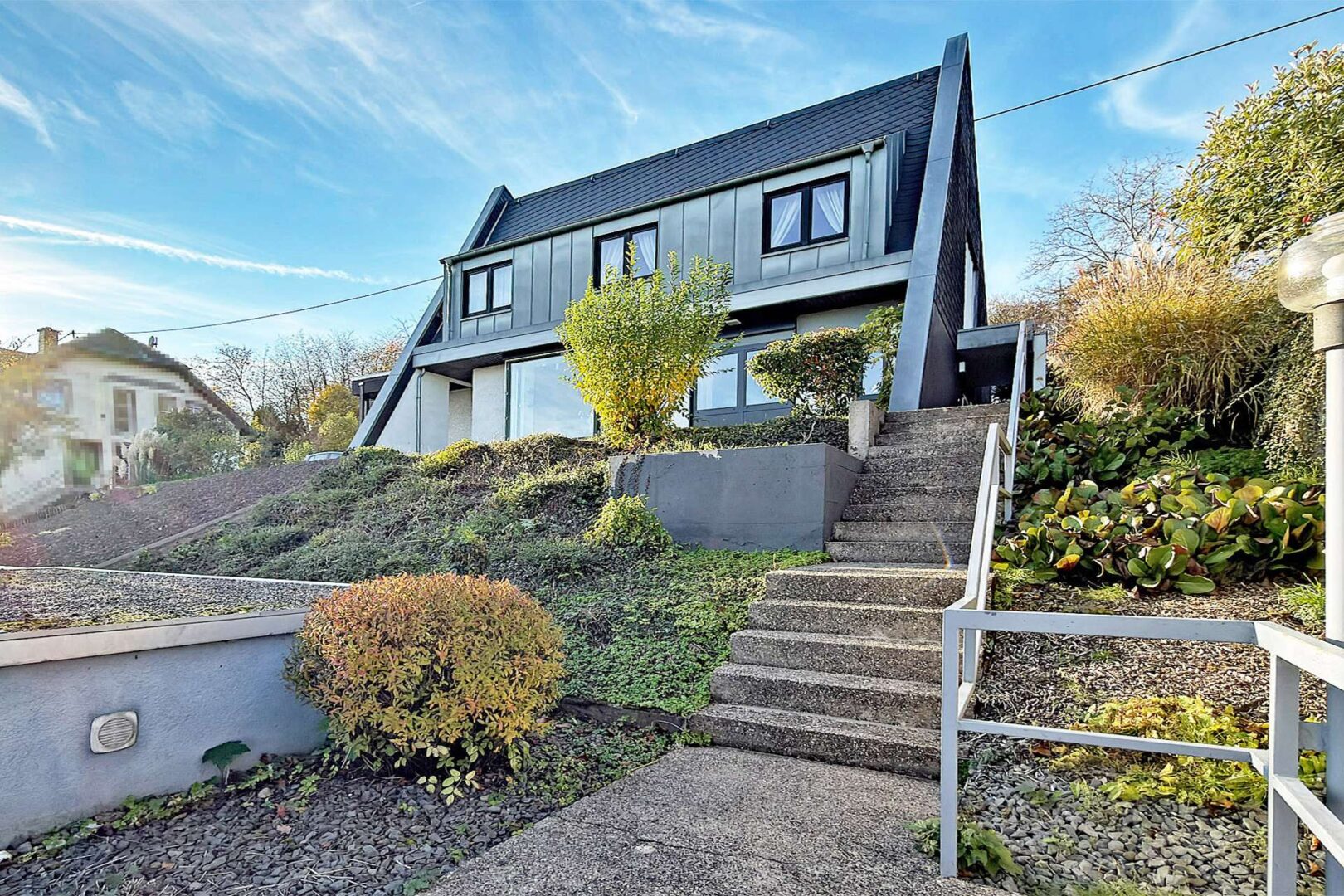 Rechter Hand der Doppelgarage gelangen Sie über eine Außentreppe zum Haupteingang des Gebäudes.