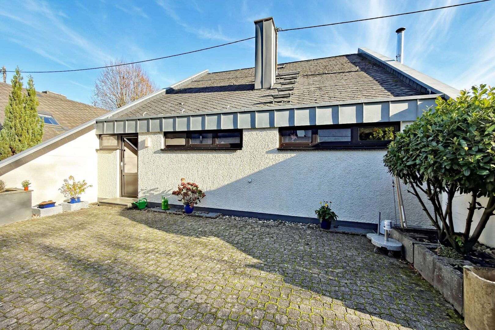 Aus dem hinteren Hauswirtschaftsraum gelangen Sie erneut in den Außenbereich auf eine zweite, blickgeschützte Terrasse zwischen Wohnhaus und Gästehaus.