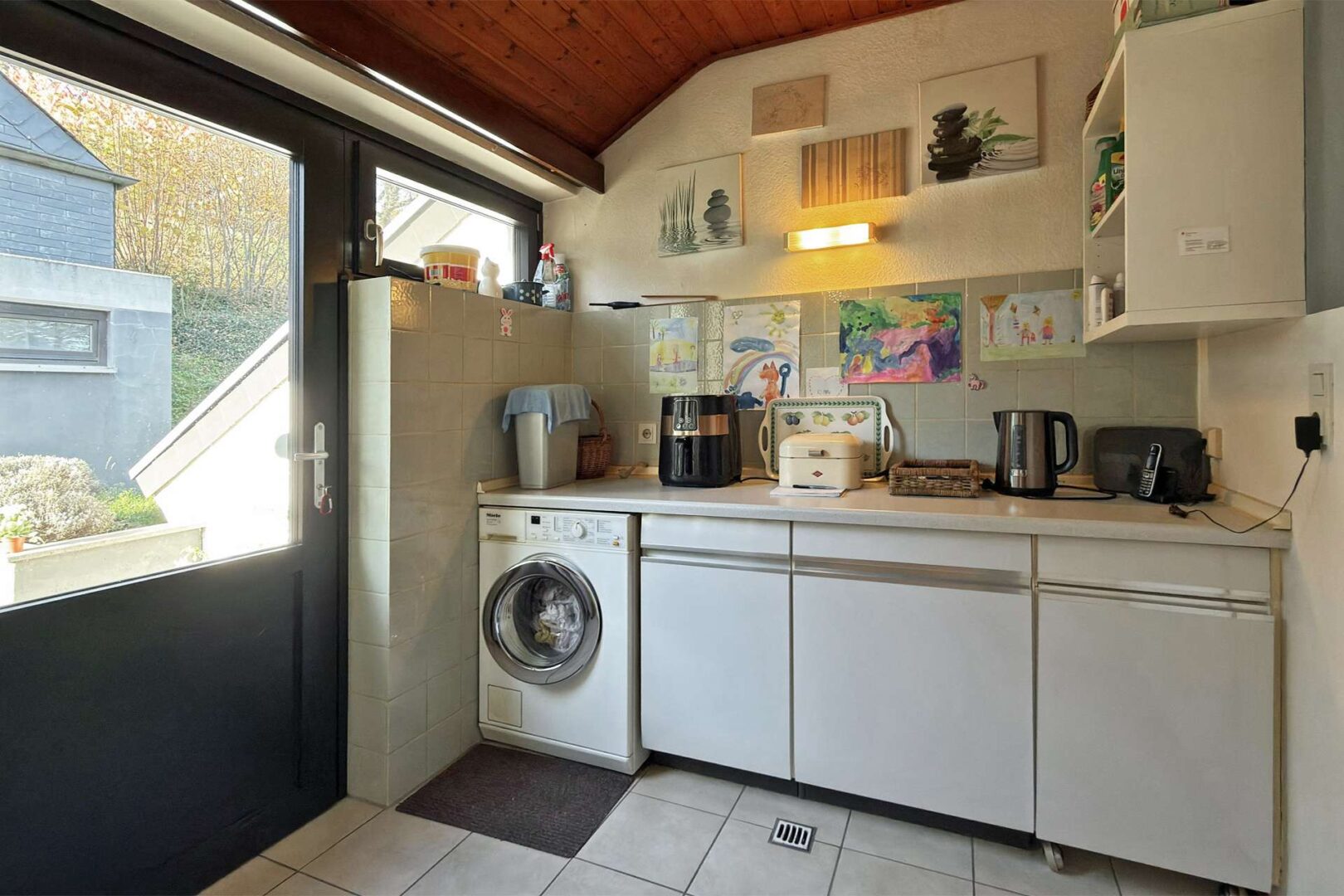 Der Hauswirtschaftsraum verfügt über Anschlüsse für Waschmaschine und Trockner. Die Küche ist inklusive der Einbaugeräte im Kaufpreis enthalten.