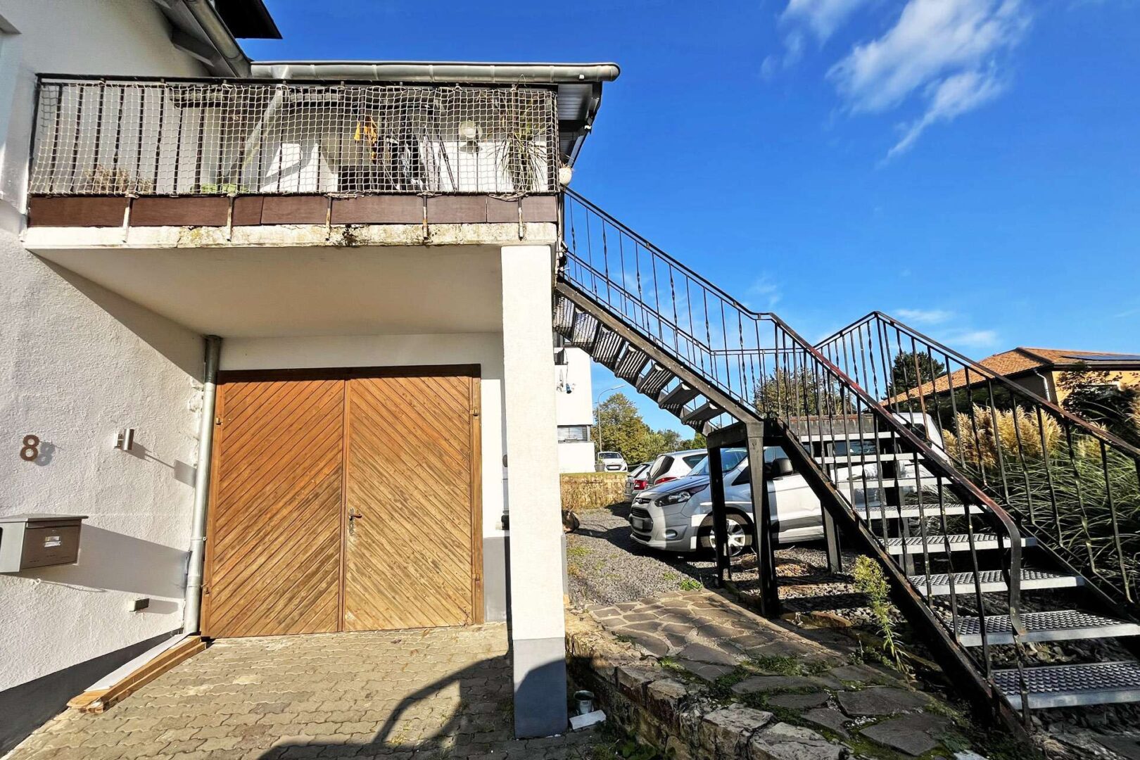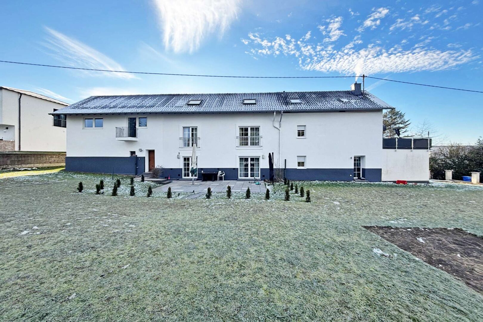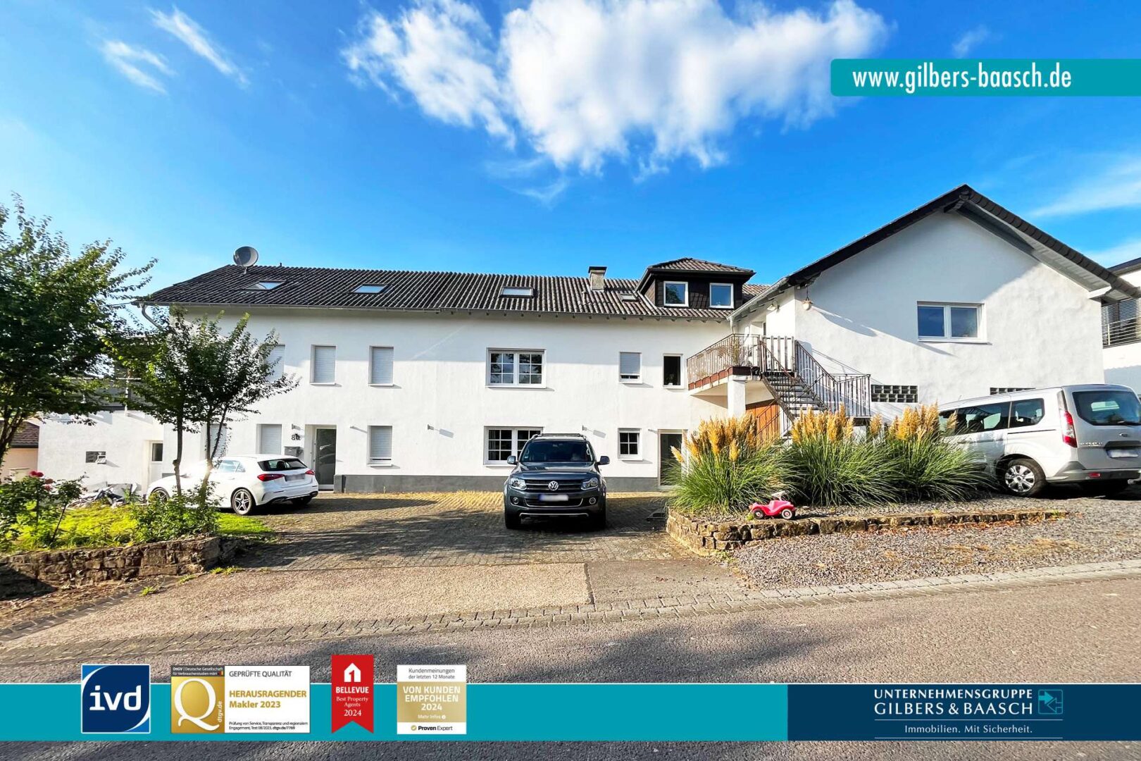 Sie erreichen das großzügige Haus in Eßlingen, nur ca. 6 km von Bitburg entfernt und können einen der sieben Stellplätze oder die Garage nutzen. Die Immobilie verfügt über ein etwa 110 m² großes Einfamilienhaus zu Ihrer Linken, ein Einfamilienhaus in der Mitte mit ca. 151 m², die Garage zur Rechten und eine Einliegerwohnung über der Garage mit etwa 90 m² Wohnfläche.