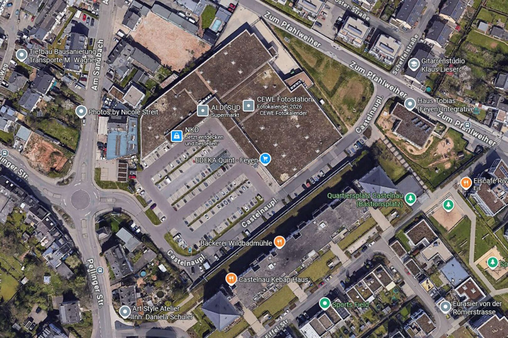 Die angebotene Gewerbefläche von etwa 256 m² befindet sich in sehr guter Lage am Castelnauplatz im Trierer Stadtteil Feyen-Weismark. Das moderne Quartier rund um den Platz hat sich in den vergangenen Jahren zu einem lebendigen Zentrum mit großem Einzugsgebiet entwickelt. Durch die direkte Nähe zu Wohngebieten, Nahversorgung und öffentlichen Verkehrsmitteln profitiert die Fläche von einer konstant hohen Frequenz und einer sehr guten Erreichbarkeit.