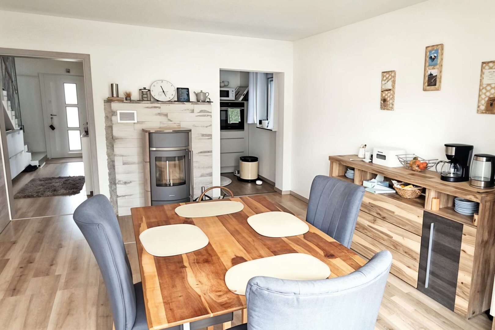 Sie erreichen Ihre neue Immobilie bequem über die gut ausgebauten Ortsstraßen des Dorfes. Zahlreiche Stellplätze stehen Ihnen direkt am Haus zur Verfügung. Bereits beim Betreten des Hauses empfängt Sie ein heller und einladender Dielenbereich. Geradeaus eröffnet sich das großzügige und lichtdurchflutete Esszimmer mit angrenzendem Wohnzimmer. Der fast 40 m² große Wohn- und Essbereich bietet ideale Voraussetzungen für die schönsten Stunden des Jahres im Kreise der Liebsten. Ein gemütlicher Holzofen ergänzt diese Räumlichkeiten perfekt und sorgt für eine behagliche Atmosphäre. Vom Esszimmer aus gelangen Sie in die gemütliche Küche, in der eine hochwertige Einbauküche bereits im Kaufpreis enthalten ist.
