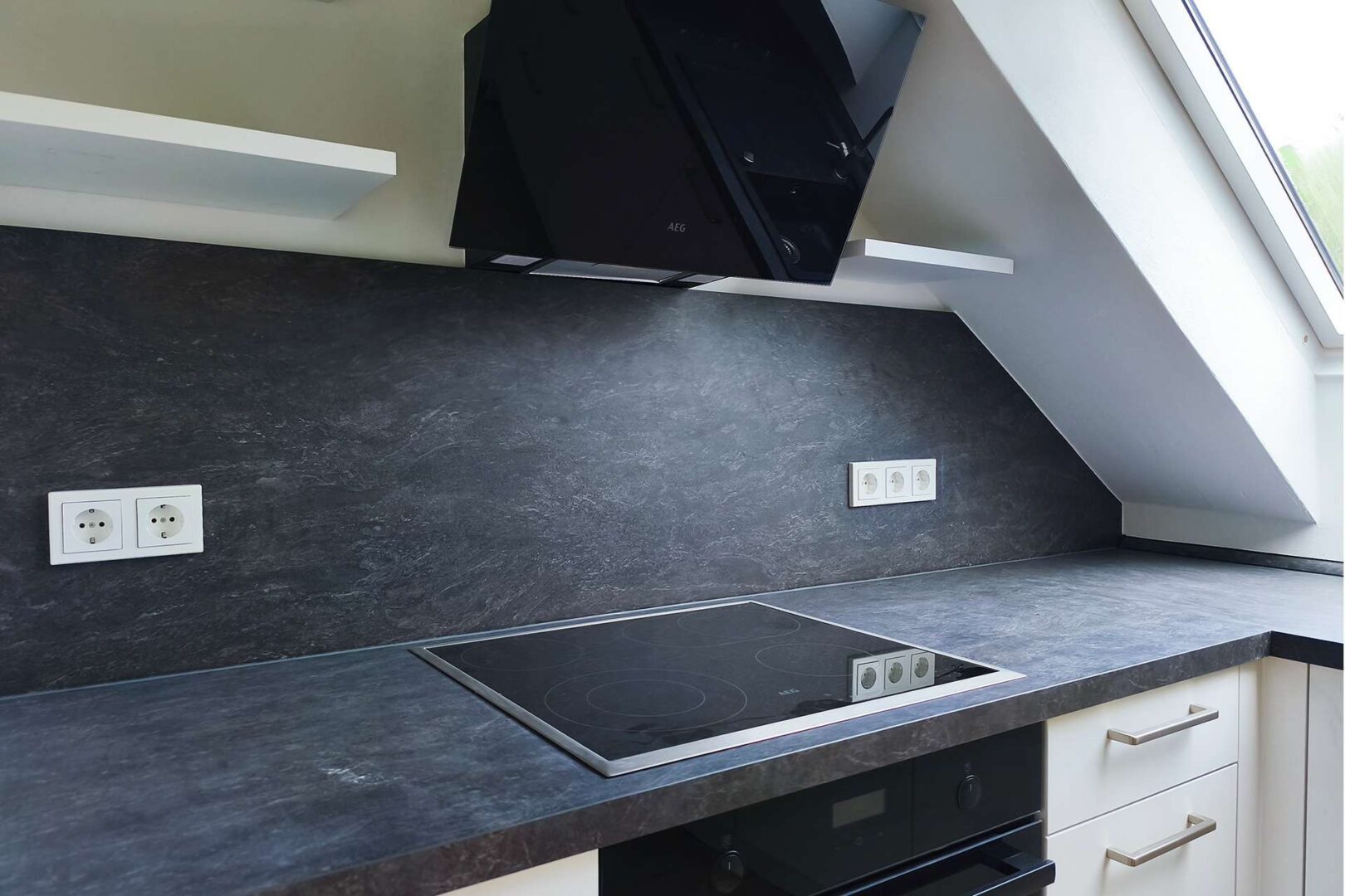 Das Raumangebot umfasst drei Zimmer, eine separate Küche mit moderner Nolte Einbauküche (40,00 € monatliche Miete zusätzlich; Ausstattung: AEG Backofen, AEG Kochfeld, AEG Dunstabzug, Siemens Geschirrspüler, und Smeg 50s Style Design-Kühlschrank) sowie ein modernes Tageslichtbad mit hochwertigen Sanitärobjekten. Große Fenster sorgen für eine lichtdurchflutete Wohnatmosphäre und bieten einen weiten Blick in die umliegenden Weinberge.
