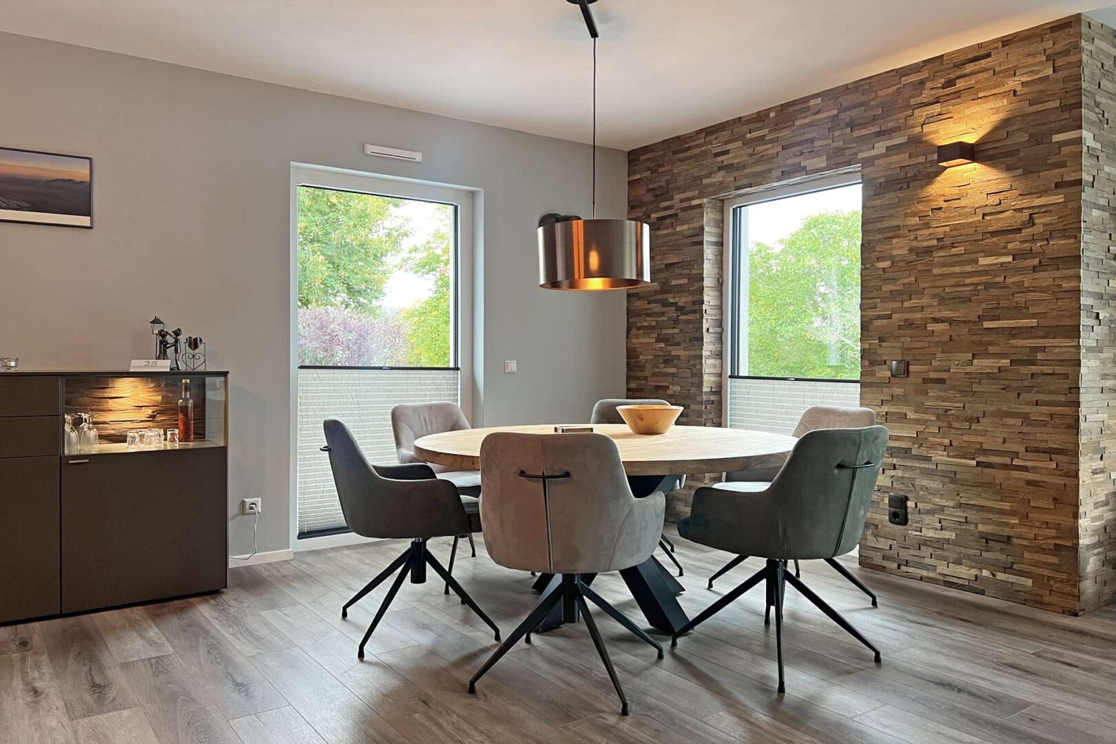 Weiterhin verfügt das Wohn- und Esszimmer über einen Anschluss für einen Kaminofen. Dieser würde insbesondere in der Übergangszeit und während des Winters ein hohes Maß an Gemütlichkeit und Heizungsunterstützung bieten.