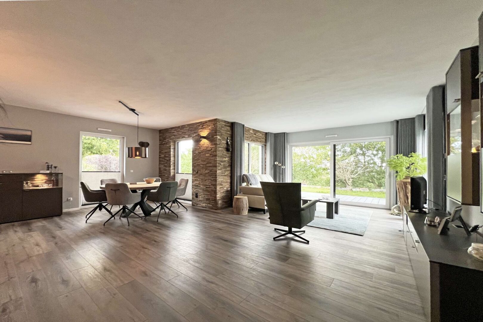 Unmittelbar geradeaus erreichen Sie das großzügige Wohn- und Esszimmer, welches durch das hohe Maß an Tageslicht besticht und eine angenehme Wohnatmosphäre kreiert.