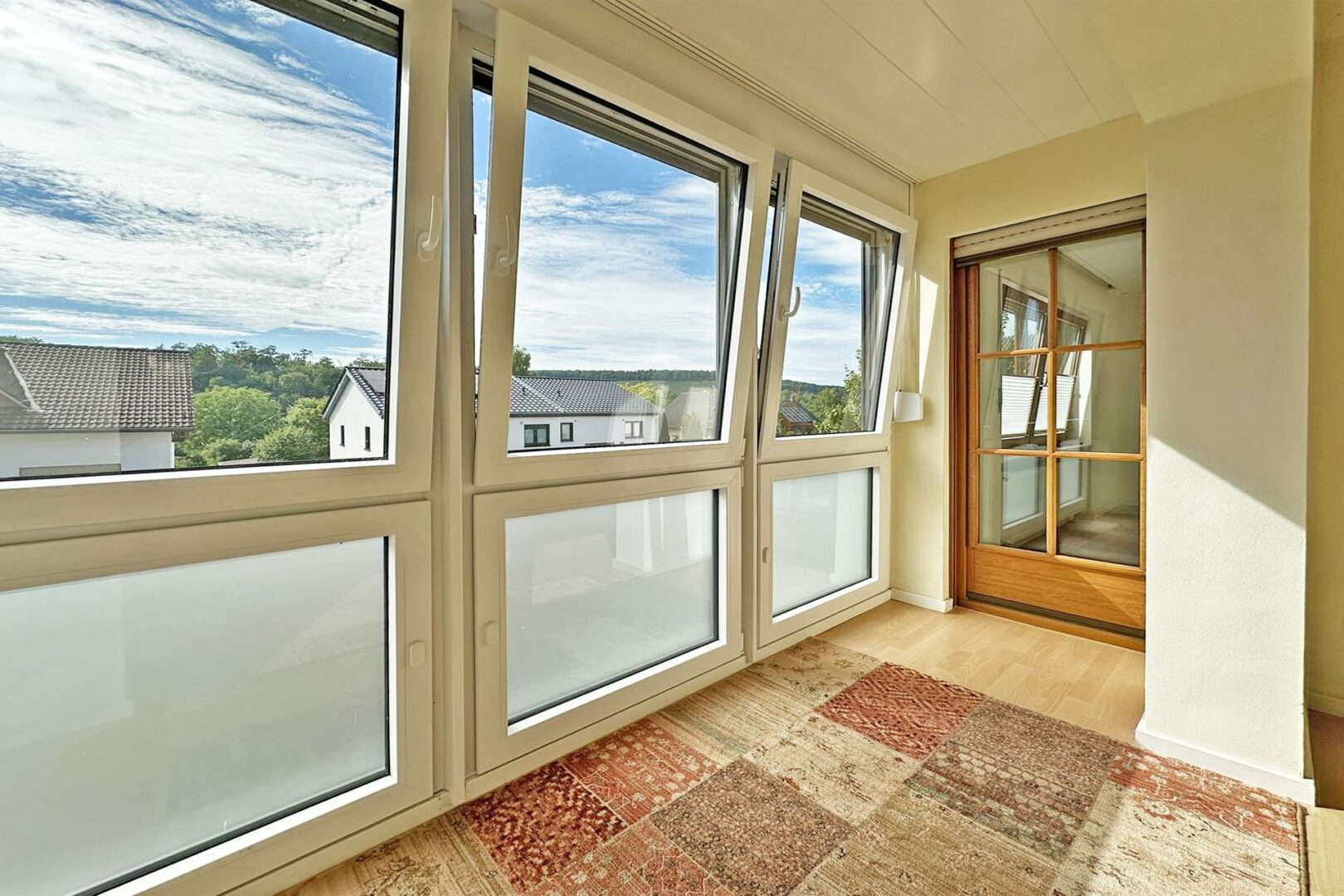 Weiter nach links gehend, gelangen Sie in einen weiteren Durchgangsraum. Dieses Zimmer ist Teil des Wohnzimmers und bietet sich optimal als Lesezimmer an. Über eine Stufe gelangen Sie in das ca. 23 m² große Hauptwohnzimmer. Das lichtdurchflutete Wohnzimmer bietet reichlich Platz zur freien Gestaltung. Der Raum verfügt über eine Art Wintergarten mit einer großen Fensterfront. Vom Wohnzimmer nach rechts gehend finden Sie eine offen gehaltene Diele mit Treppenhaus.