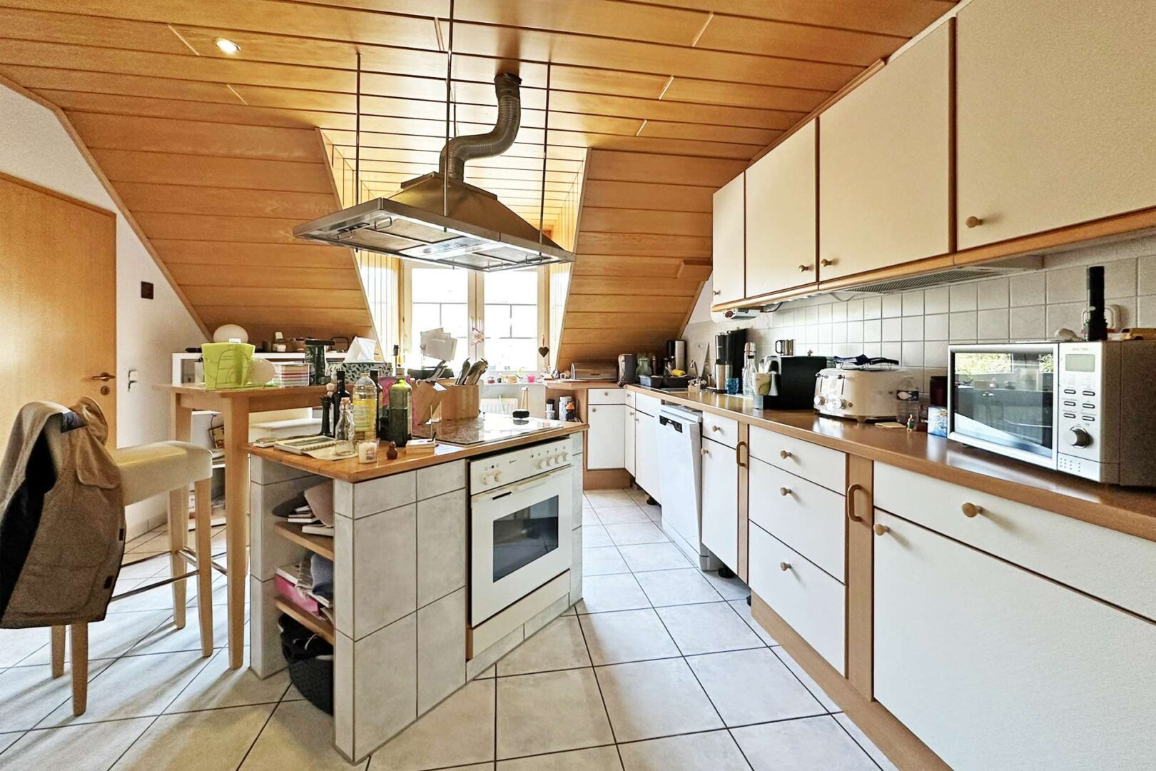 Rechter Hand der Diele gelangen Sie in die separate, ca. 15 m² große Küche, die samt Einbaugeräten im Kaufpreis enthalten ist. Angrenzend an die Küche befindet sich ein ca. 4 m² großer, praktischer Vorratsraum.