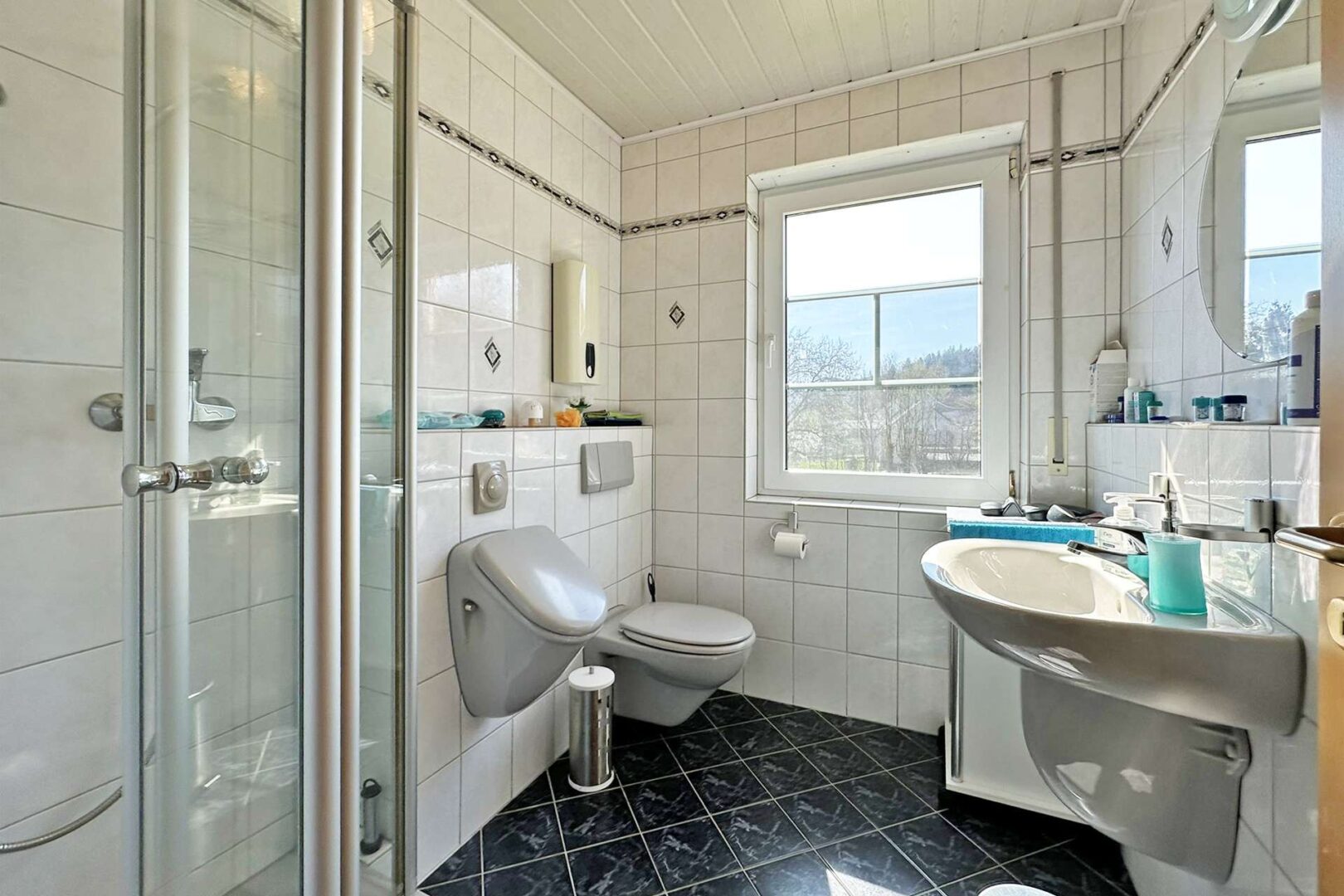 Linker Hand der Diele befinden sich zwei Schlafzimmer mit einer Größe von ca. 14 m² und 19 m², die sich ideal als Kinder- oder Gästezimmer eignen. Ebenfalls finden Sie hier zwei vollwertige Tageslichtbadezimmer. Das erste Badezimmer ist ausgestattet mit einer Dusche, einer Badewanne, einem WC und einem großen Waschtisch. Das zweite Badezimmer dient ideal als Gästebad und verfügt über eine Dusche, ein WC, ein Pissoir und einen Waschtisch.