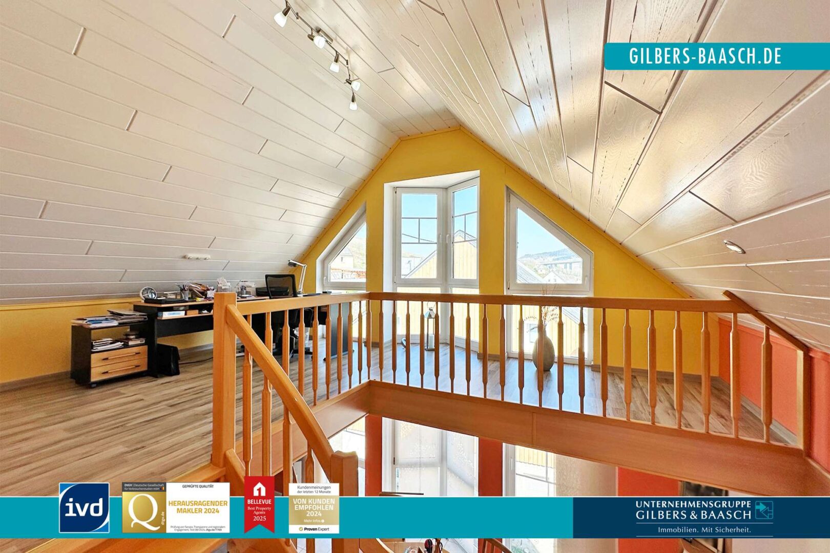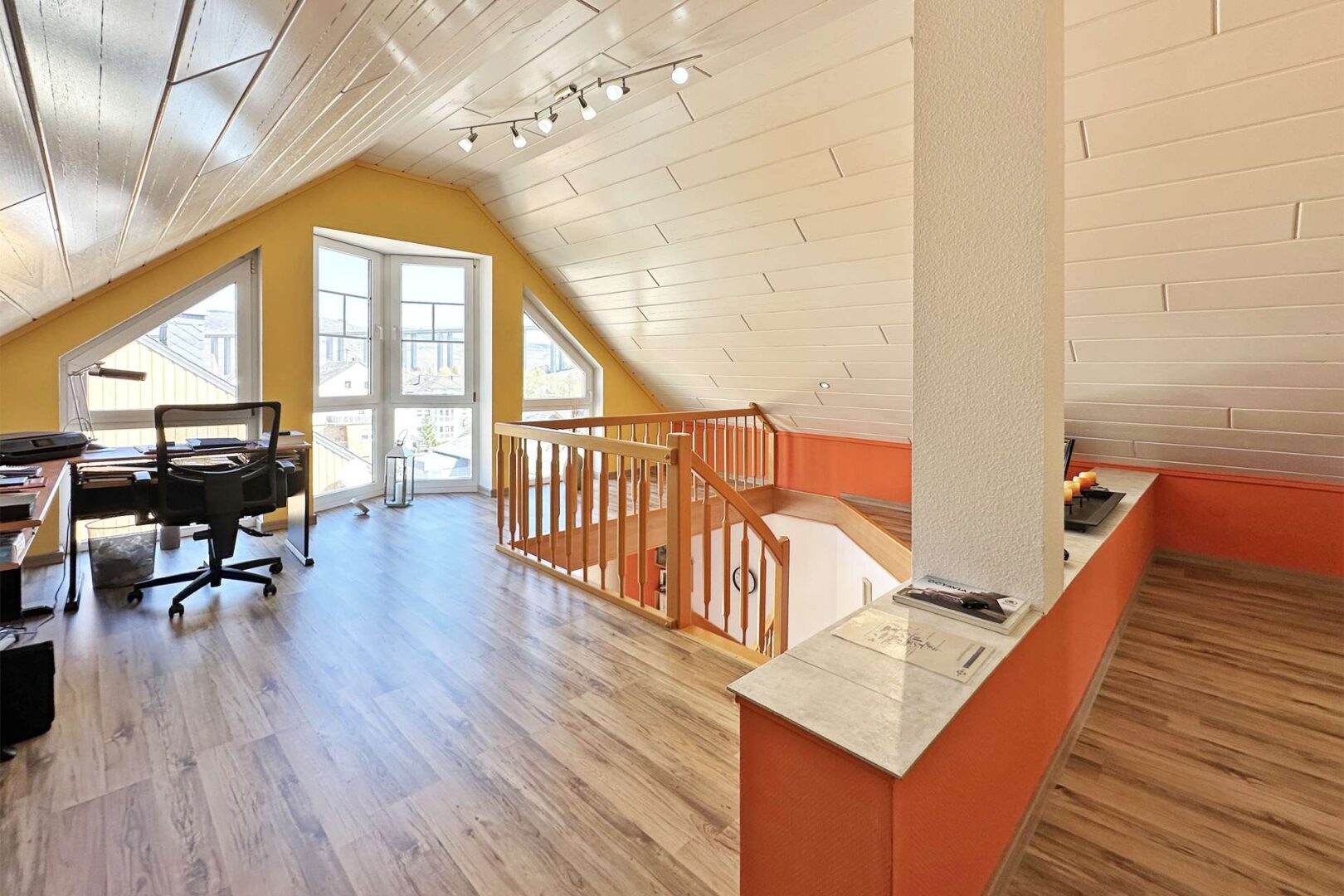 Im Dachgeschoss angekommen, empfängt Sie eine helle, offen gestaltete Galerie, die ausreichend Platz für ein Büro oder eine Leseecke bietet. Diese Etage verfügt zudem über einen praktischen Abstellraum. Zu guter Letzt befindet sich hier ein großes, helles Schlafzimmer mit viel Platz – zum Beispiel für ein Bett, eine Couch und Kleiderschränke.