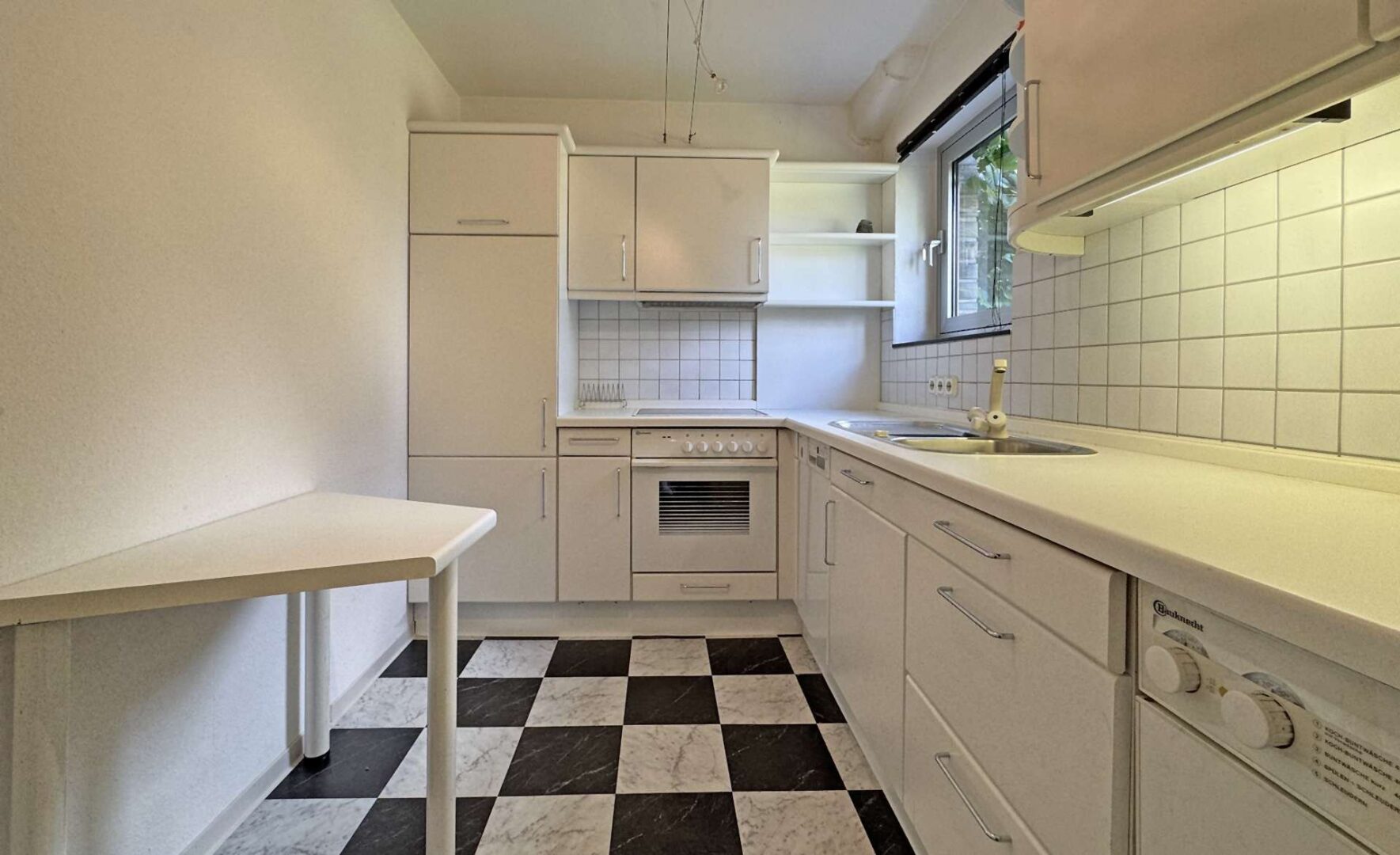 Zurück im Haus, wird die Etage durch eine ca. 11,5 m² große Küche mit großer Fensterfront ergänzt, die über eine weitere Diele ebenfalls zurück zum Eingangsbereich führt.