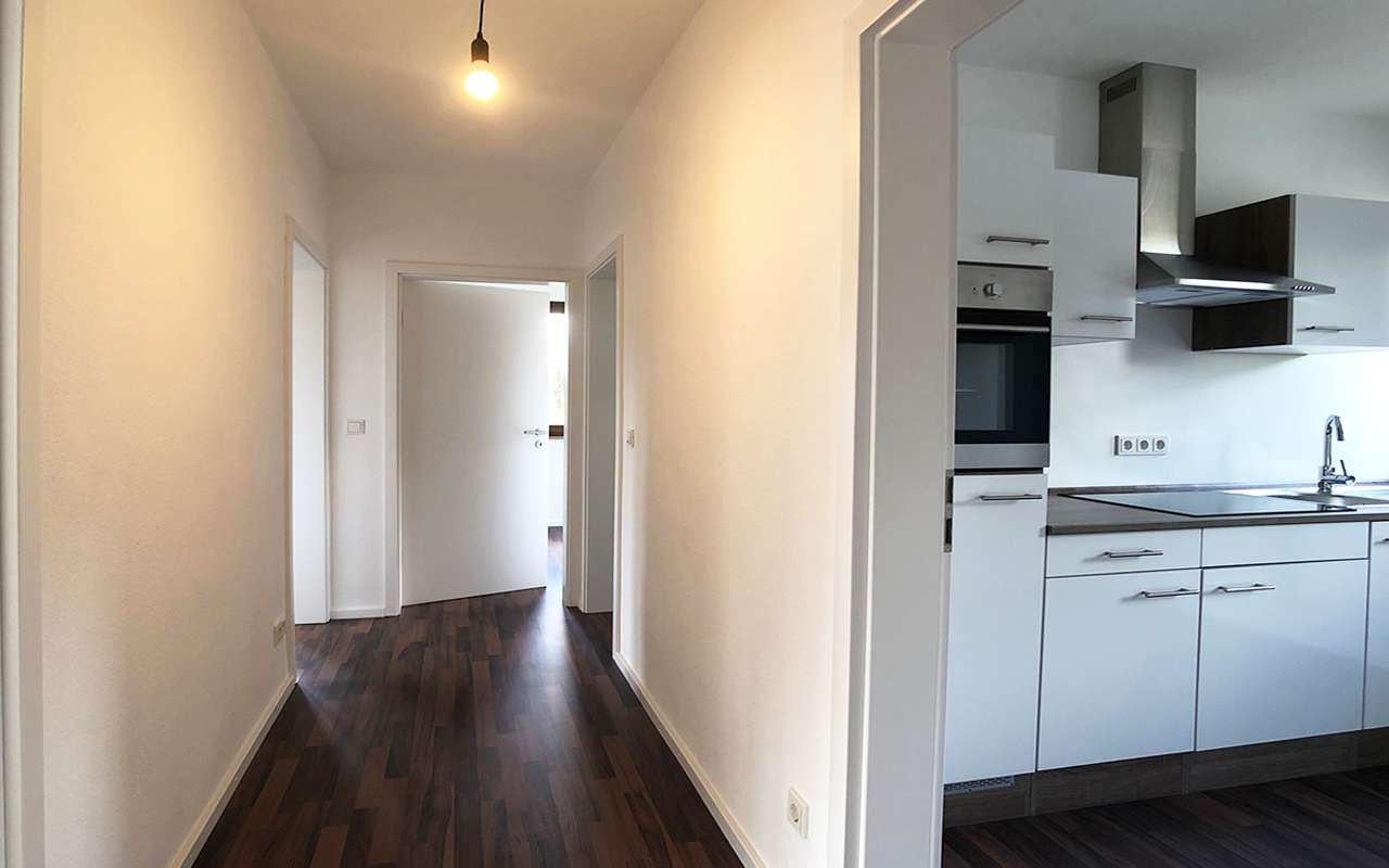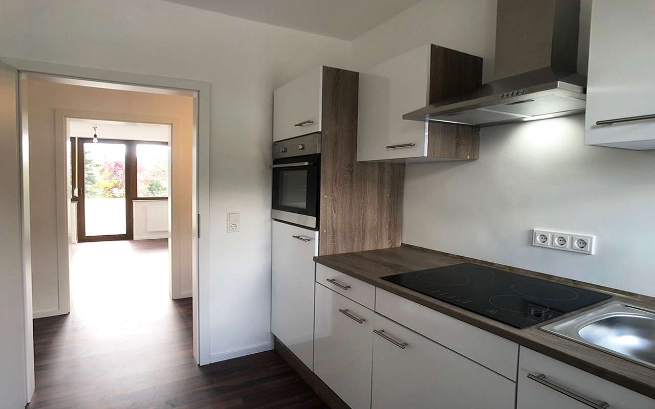 Die hellen Wohnräume und die Küche sind mit hochwertigem Laminatboden ausgestattet.