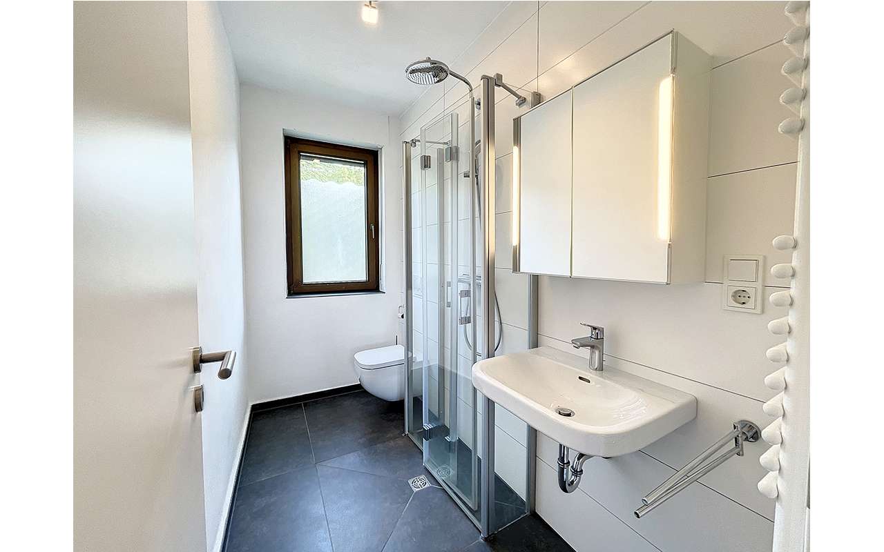 Das moderne Bad verfügt über eine ebenerdige Dusche mit platzsparender, faltbarer Duschkabine und einem Handtuchheizkörper.