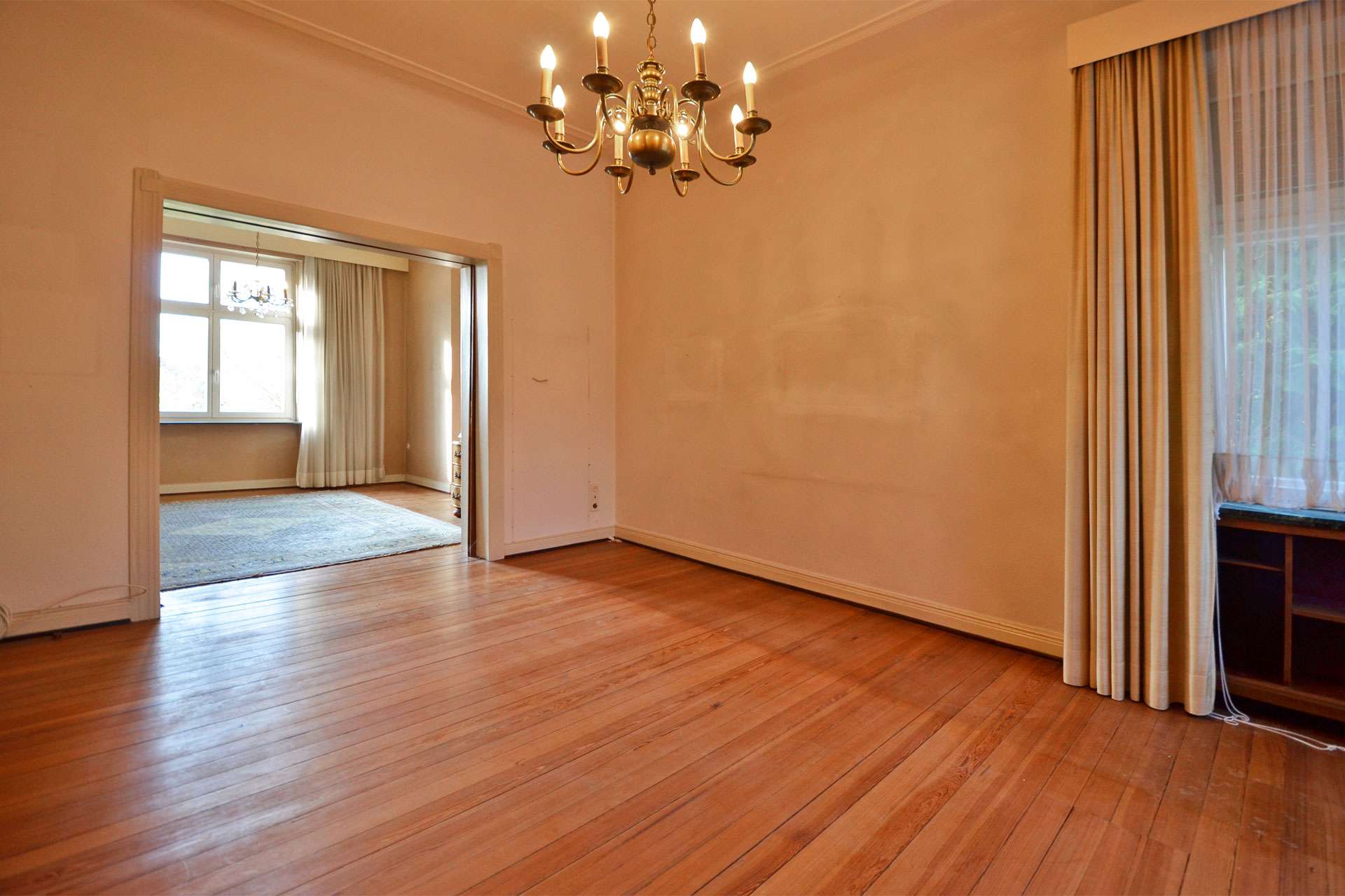 Durch eine charmante Flügeltür aus dunklem Holz mit Glaselementen erreichen Sie die Wohnräume des Hauses. Es empfängt Sie der einladende Flur mit ansprechendem Treppenhaus. Von hier führt eine Tür zu Ihrer Rechten in ein separates Zimmer, das als Büro oder Gästezimmer genutzt werden kann. Anschließend öffnet sich der helle Wohnbereich, verbunden über eine stilvolle Schiebetür aus Holz mit Buntglas zum Essbereich, in dem noch der historische Speiseaufzug erhalten ist. Ein weiterer Raum besticht durch extra breite Fensterbänke und große Fenster, die einen herrlichen Blick in den Garten ermöglichen. Von hier gelangen Sie über eine Steintreppe außerdem direkt in den Außenbereich.