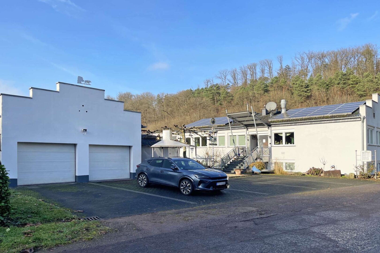Abgerundet wird dieses attraktive Angebot durch eine Doppelgarage mit zusätzlichem Stauraum. Die hervorragende Sichtpräsenz an der Ortsein- und -ausfahrt bietet zudem ideale Voraussetzungen für eine werbewirksame Außenpräsentation des Betriebs.