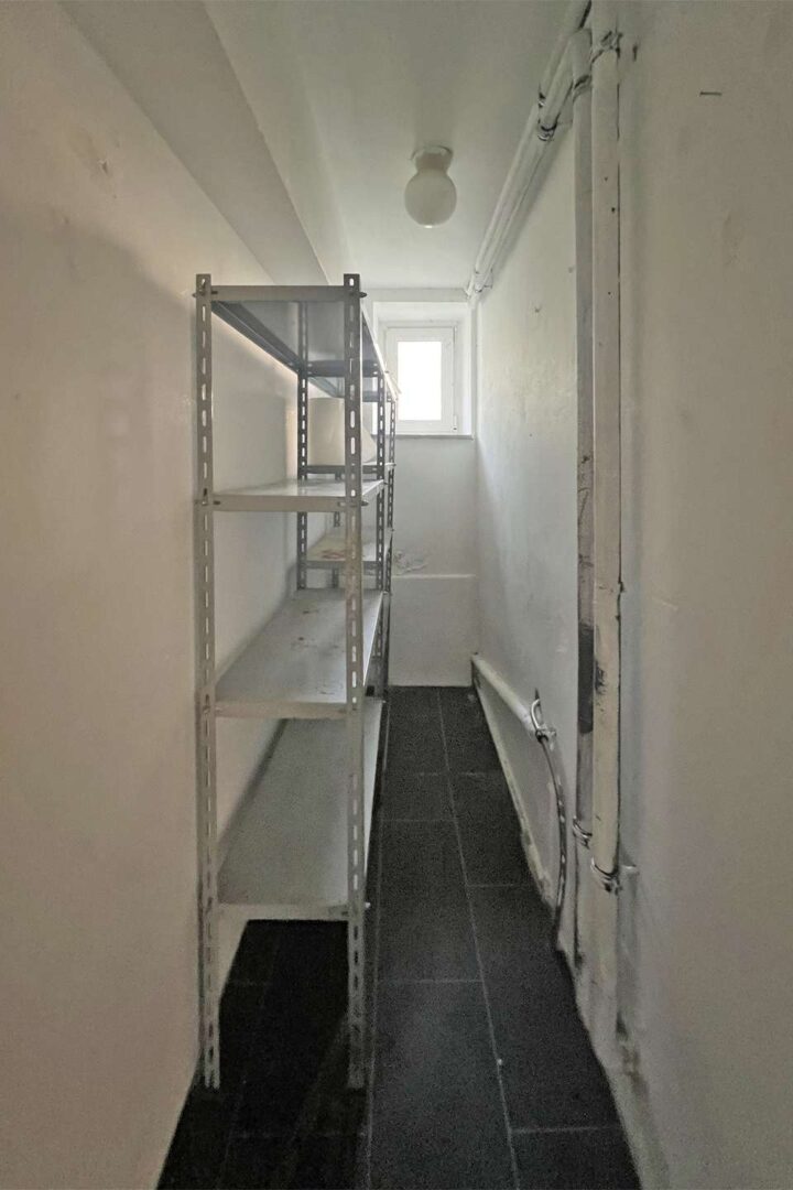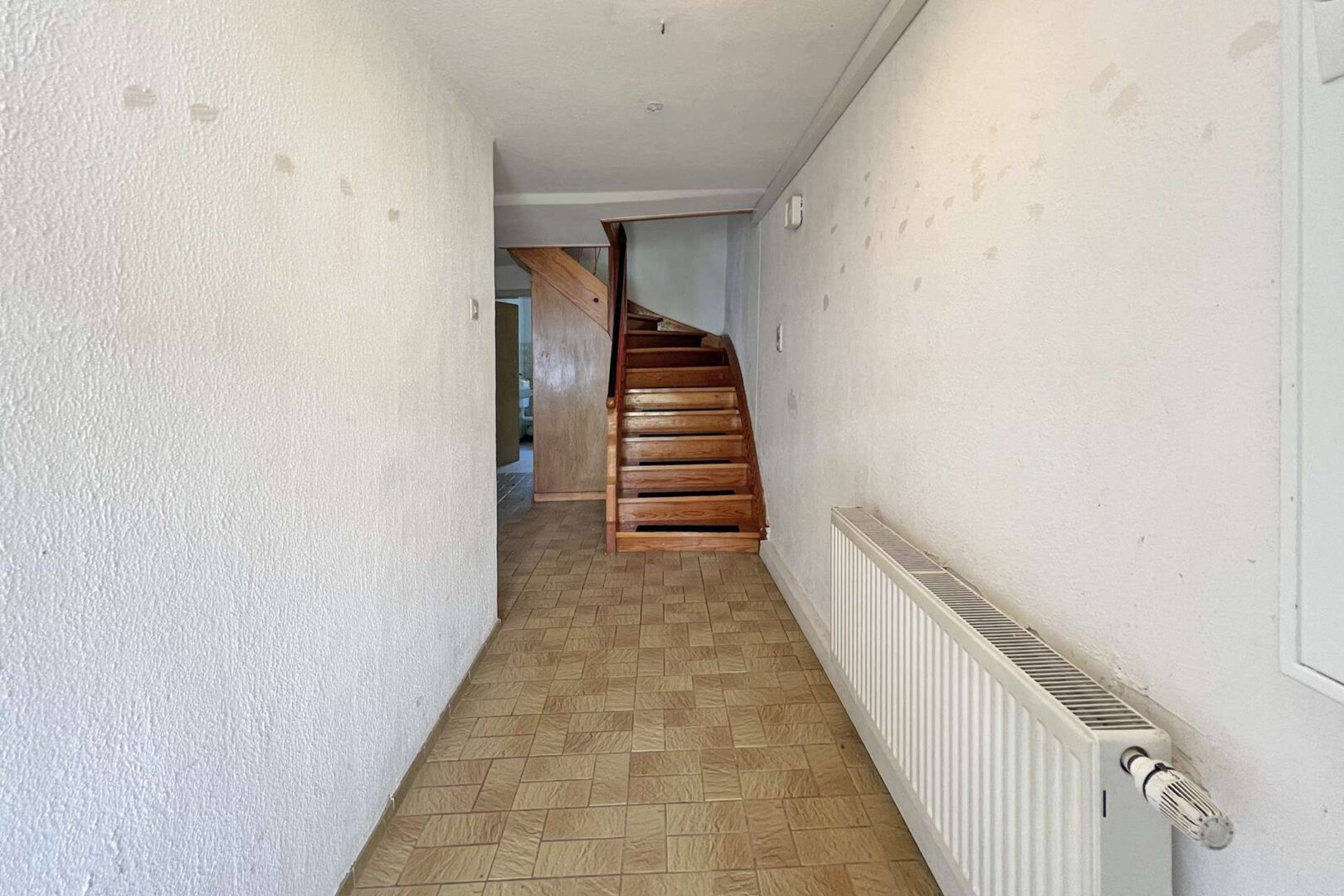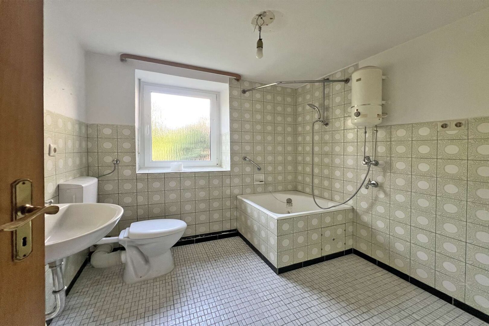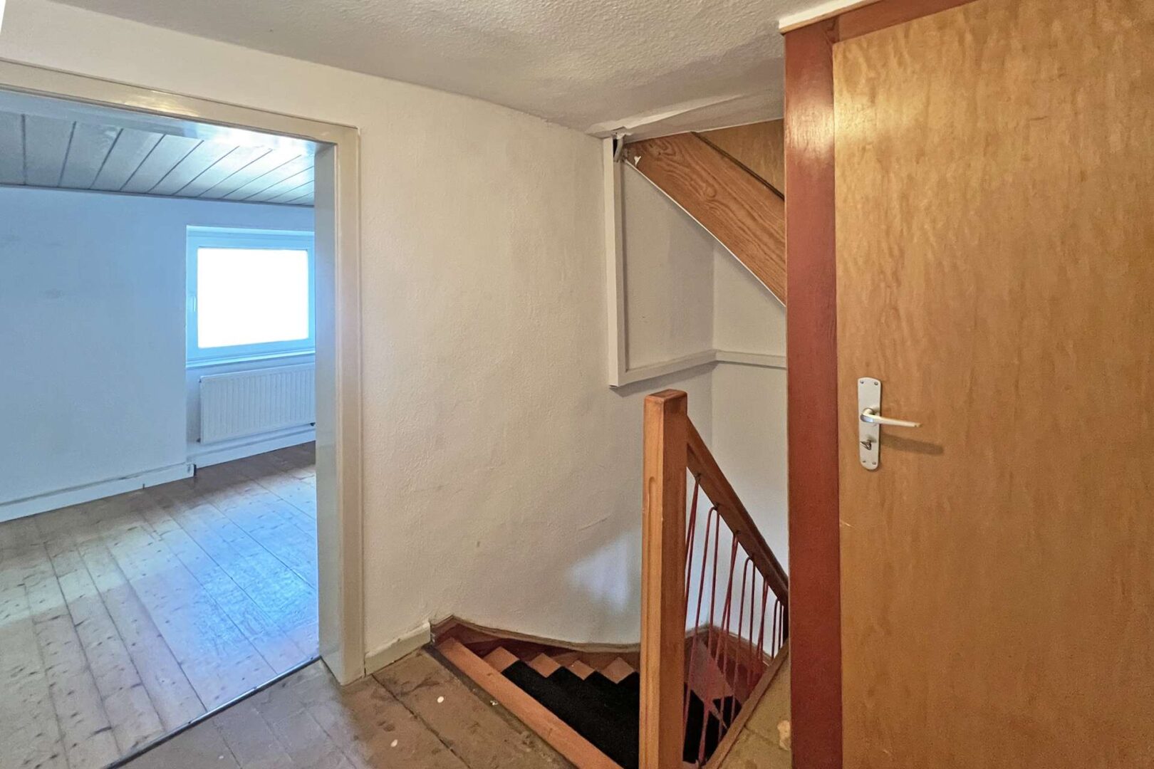 Zurück im Hausflur des Erdgeschosses finden Sie am Treppenaufgang vorbei noch den Zugang in den Keller sowie in ein zeitgemäßes Badezimmer mit Dusche, WC und Waschtischelement. Über die Holztreppe im Flur nach oben finden Sie im ersten Obergeschoss insgesamt zwei Zimmer.