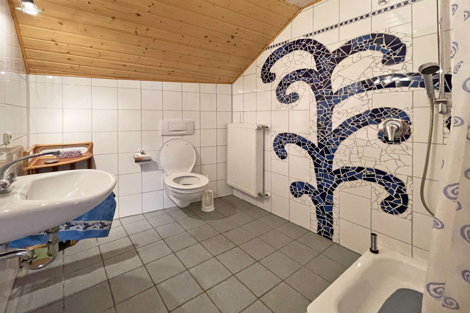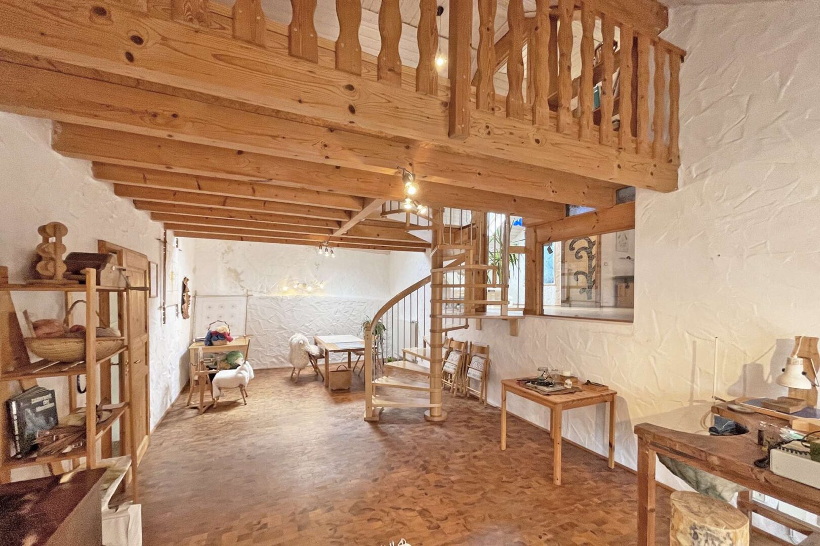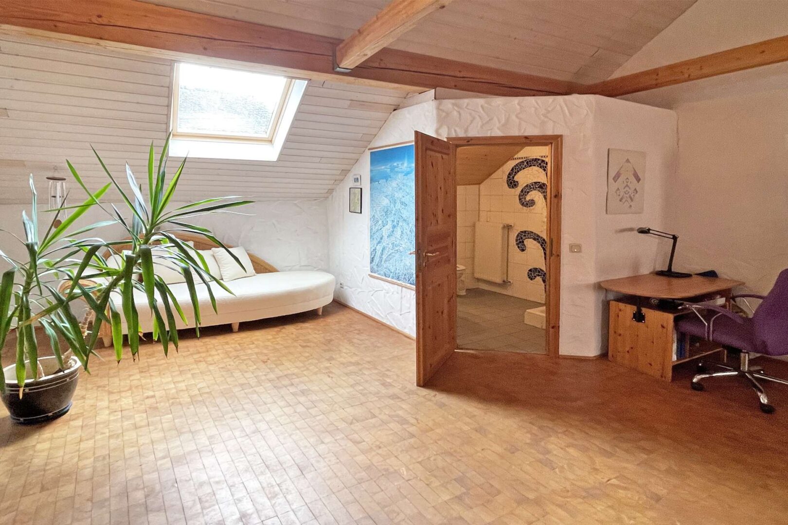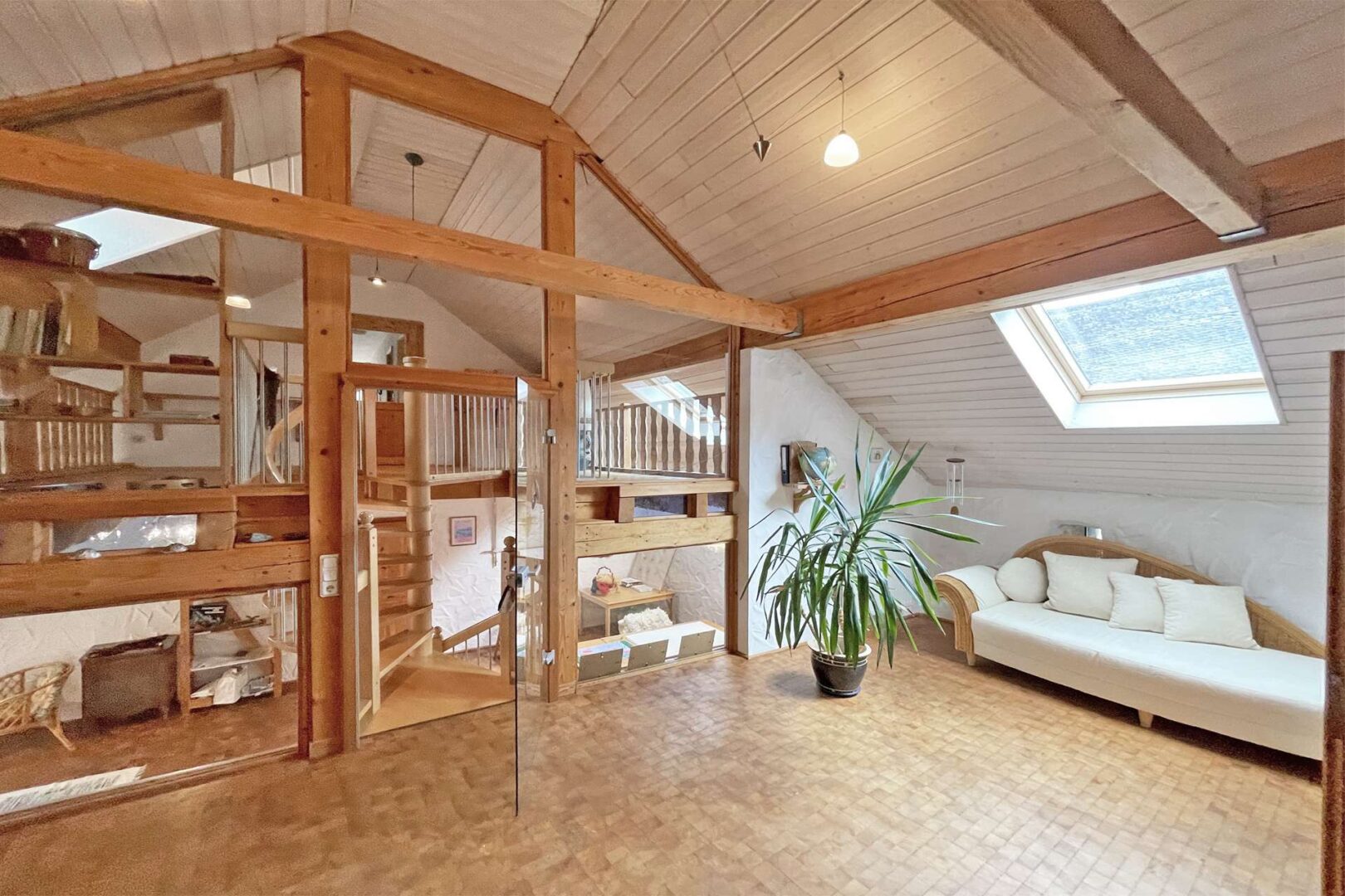 Ein Durchgang zum ehemaligen Wirtschaftsgebäude oder die massive Treppe im Dielenbereich führen Sie in das Dachgeschoss der Nebengebäude, wo Sie ein fantastisches Atelier mit Wendeltreppe und hochwertigem Holzbaustil empfängt. Von hier aus erreichen Sie auch einen weiteren Bereich zum Wohnen und Arbeiten mit eigenem Badezimmer.