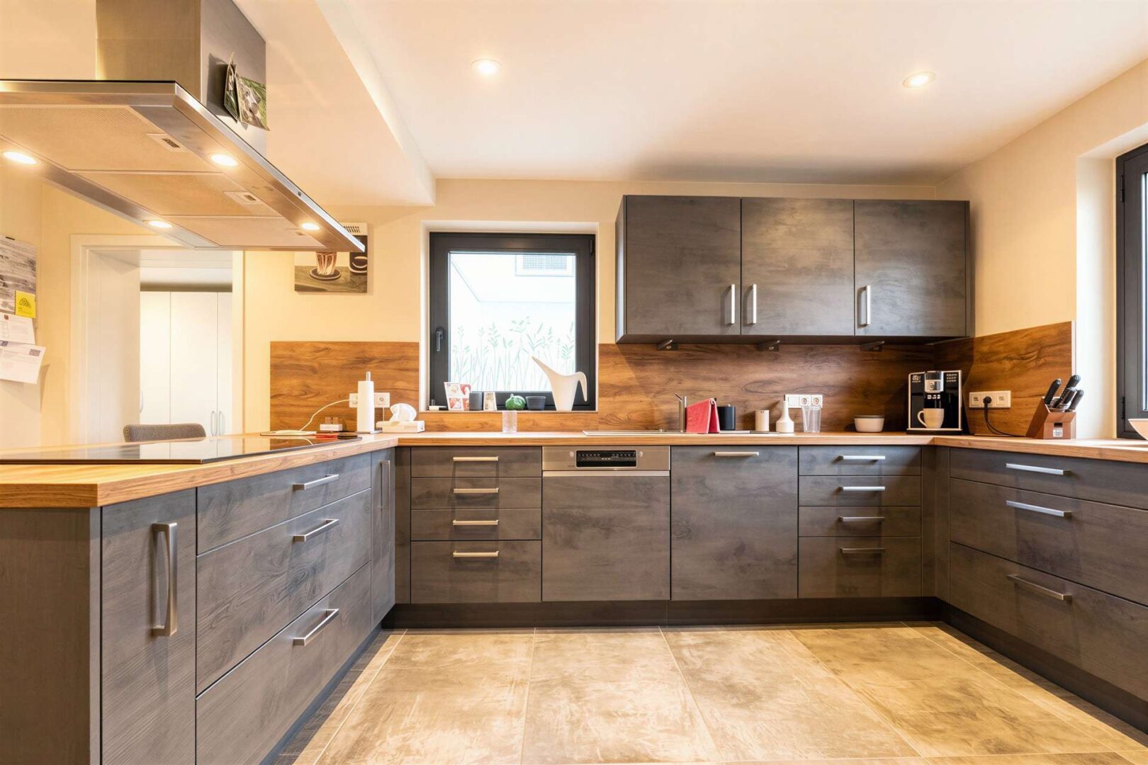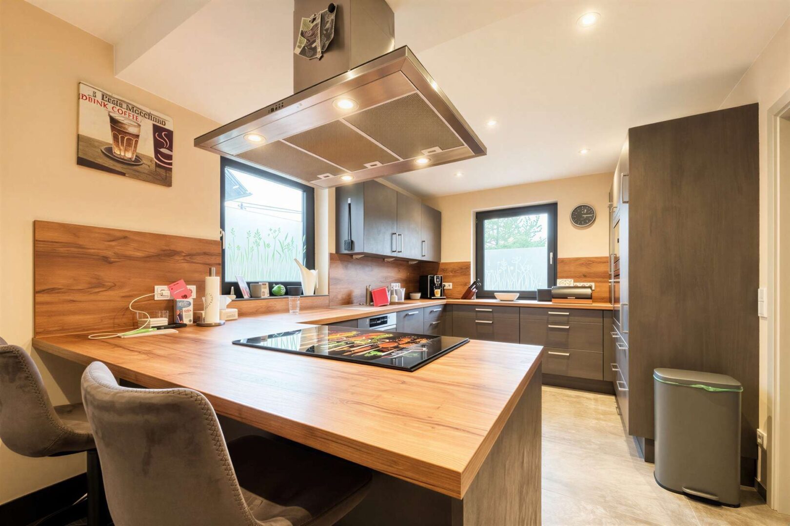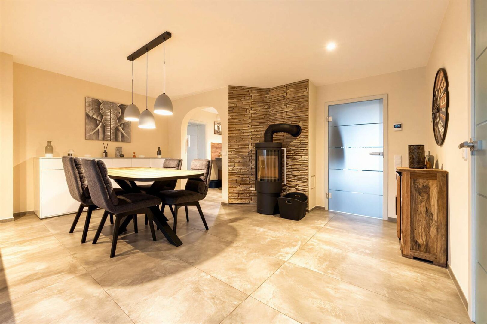 Rechts davon befindet sich die moderne Küche (Baujahr 2022) mit praktischer Frühstückstheke. Der angrenzende Essbereich ist offen gestaltet und geht nahtlos in den weitläufigen Wohnbereich über. Große Fensterfronten sorgen hier für viel Tageslicht und schaffen gemeinsam mit dem gemütlichen Holzofen eine besonders behagliche Wohnatmosphäre.