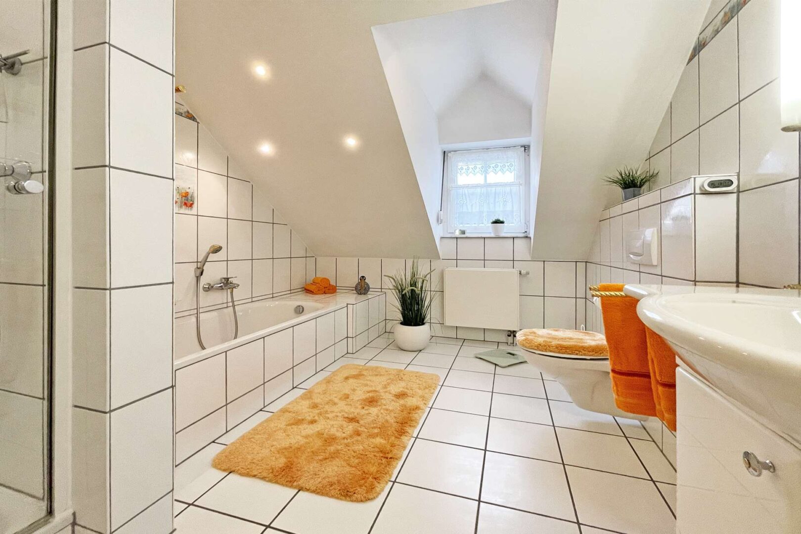 Ein ehemaliges Schlafzimmer, das derzeit als Esszimmer genutzt wird, befindet sich ebenfalls direkt neben dem Wohnzimmer. Ergänzt wird das Erdgeschoss durch ein saniertes Tageslichtbad mit Dusche, WC und Abstellraum.