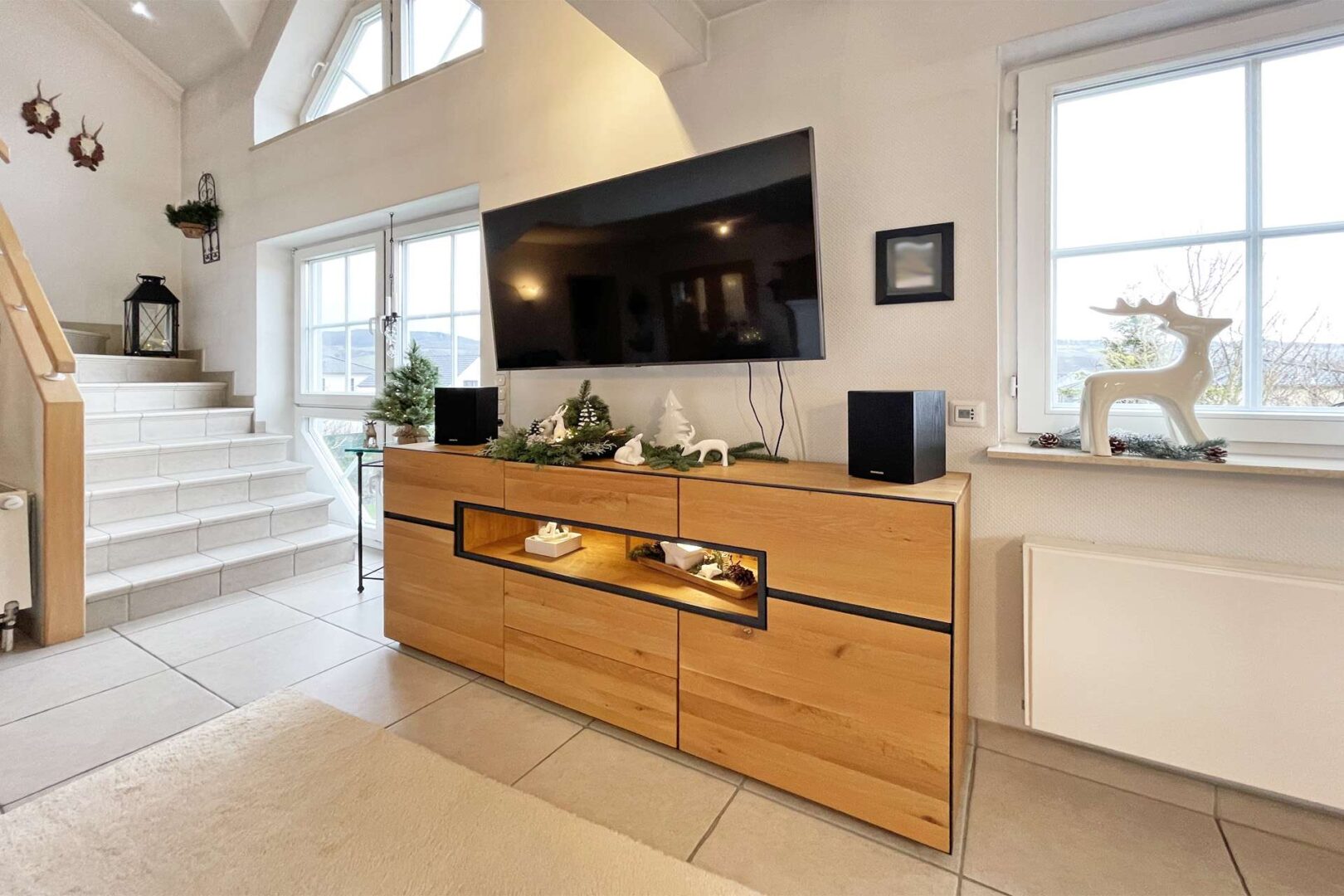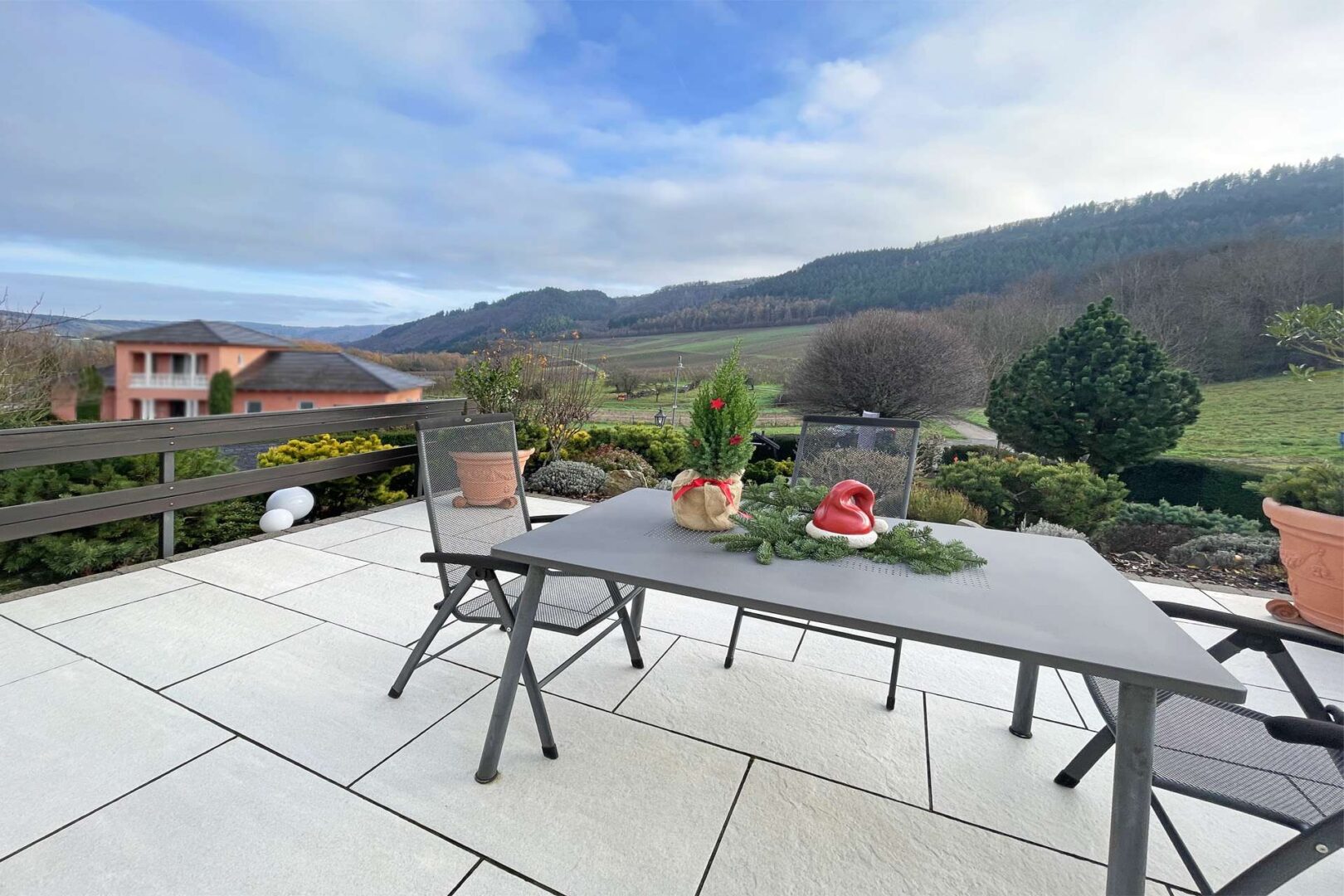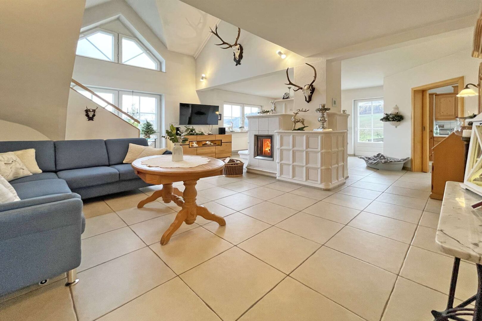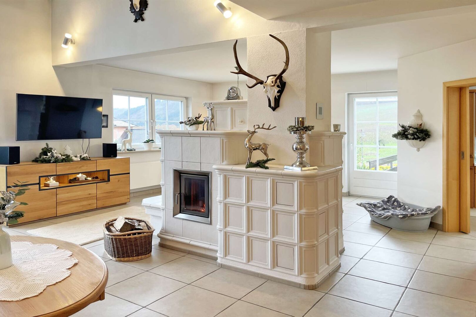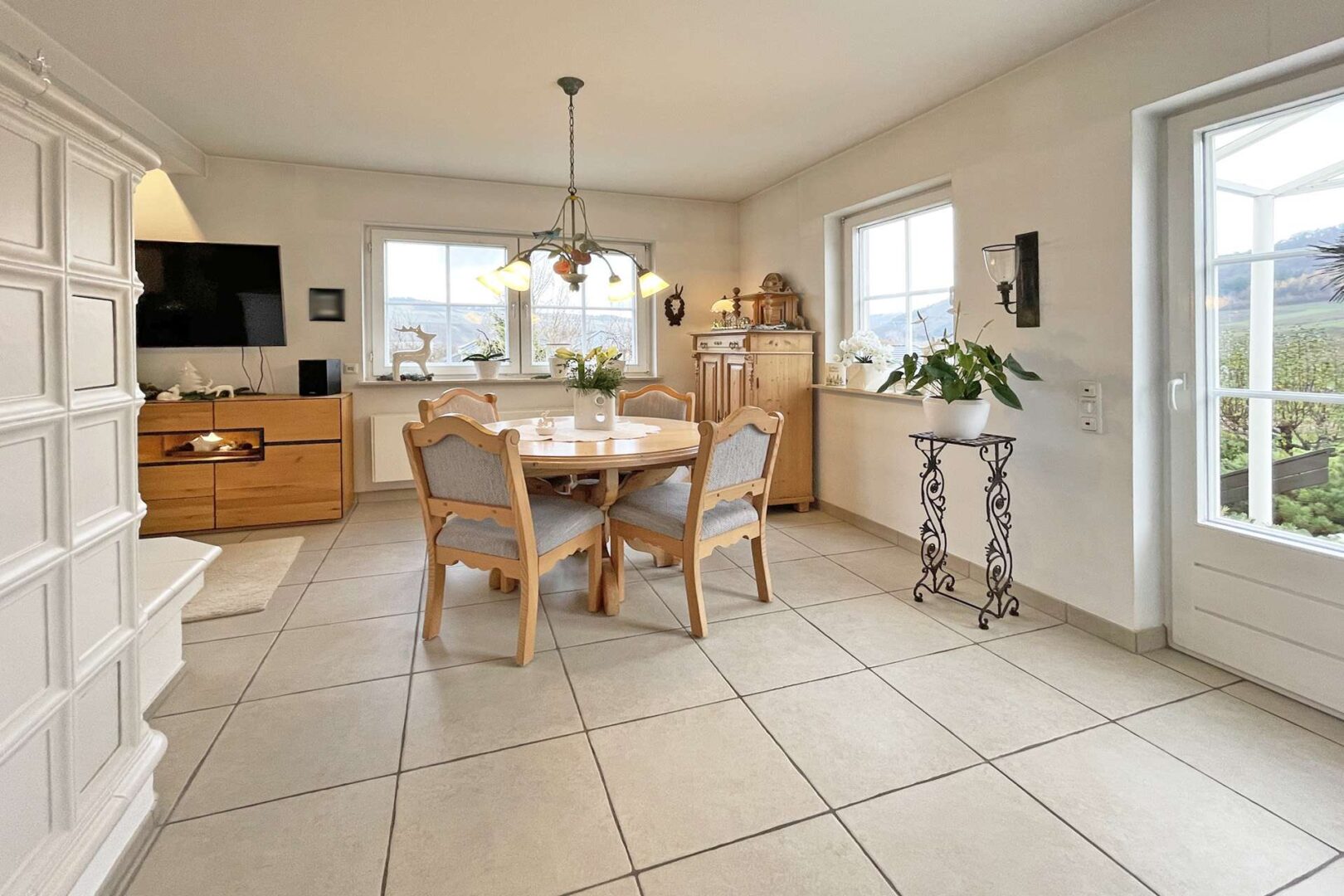 Das ca. 40 m² große Wohnzimmer ist lichtdurchflutet und bietet wegen des durchdachten Zuschnitts viel Raum für das Familienleben. Ein moderner, hochwertiger "Brunner" Holzofen sorgt in den kühleren Monaten für eine besonders gemütliche Atmosphäre. Vom Wohnzimmer aus gelangen Sie direkt in die geräumige Küche – ein idealer Ort für gemeinsame Kochmomente. Angrenzend zum Wohnzimmer befindet sich die erste, großzügige Sonnenterrasse mit einem fantastischen Weitblick in den Garten und die vom Weinbau geprägte Umgebung.