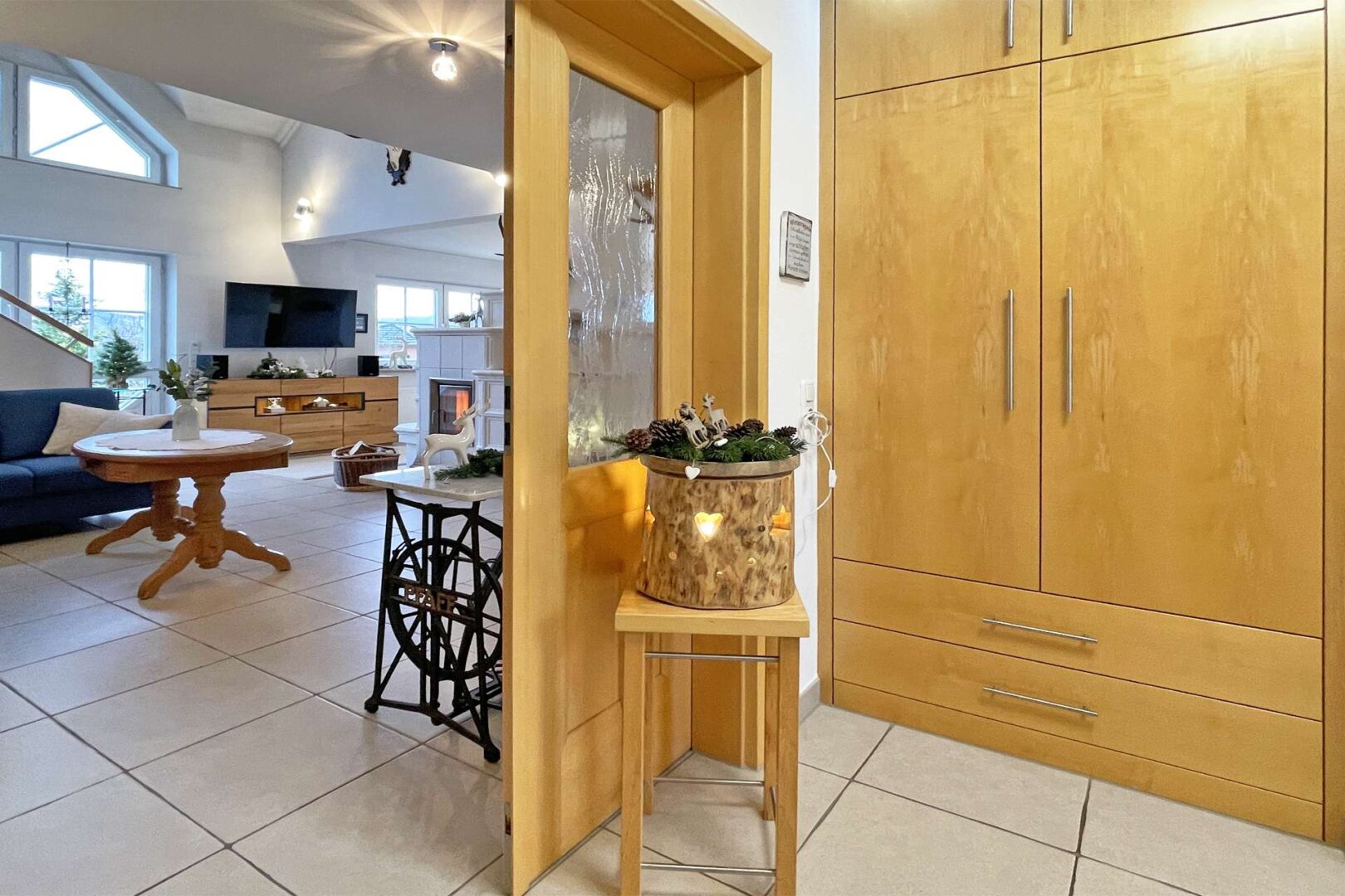 Der Zugang zum Haus erfolgt über den schönen Hof vor dem Eingangsbereich. Alternativ gibt es ebenfalls die Möglichkeit, bequem und wettergeschützt über die großzügige Garage im Kellergeschoss die Immobilie zu betreten. Die freundlich gestaltete Diele empfängt Sie mit einem hellen Ambiente und führt Sie direkt in den Wohnbereich.