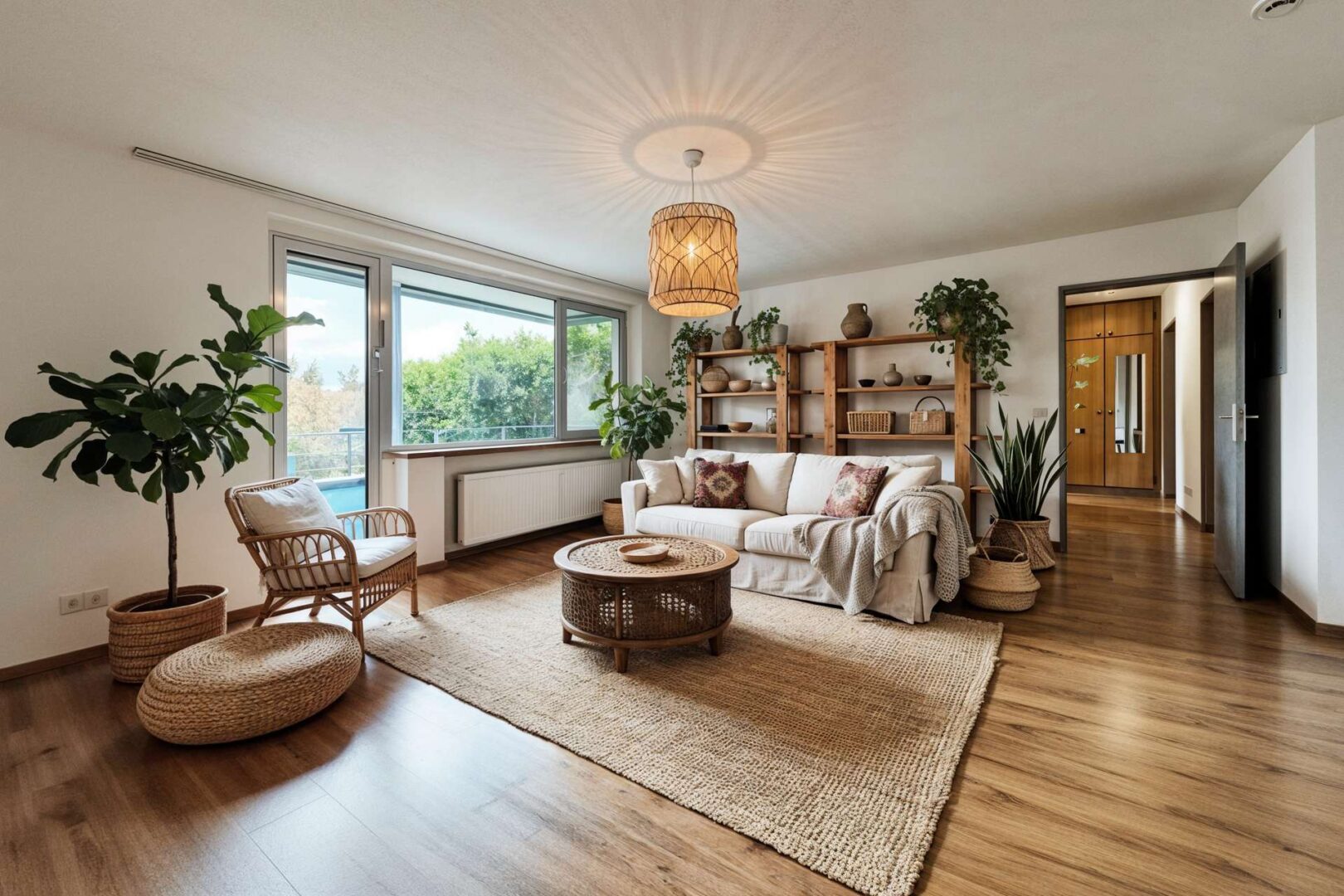 Nach dem Betreten der Wohnung eröffnet sich Ihnen der großzügige Wohnbereich, der sofort mit Helligkeit und einem offenen, einladenden Ambiente überzeugt. Große Fensterflächen und ein direkter Zugang zum überdachten Balkon schaffen einen Rückzugsort – ideal, um die Abendsonne zu genießen oder den Morgen mit einer Tasse Kaffee zu beginnen.