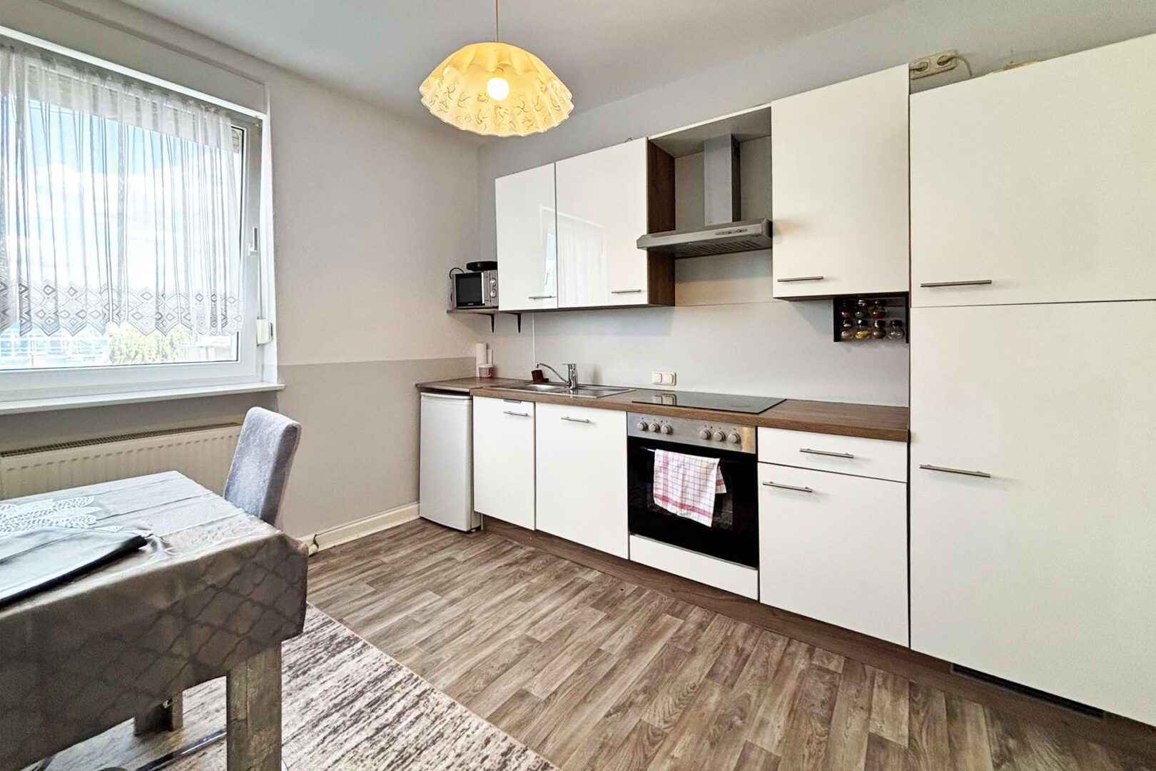Die Wohnung zeigt sich modern und wurde zuletzt vor der Neuvermietung renoviert. Sie verfügt über zwei Schlafzimmer zur Linken und zur Rechten, ein Tageslichtbad mit Duschwanne und WC, einen Koch- und Essbereich sowie ein sehr großzügiges Wohnzimmer.