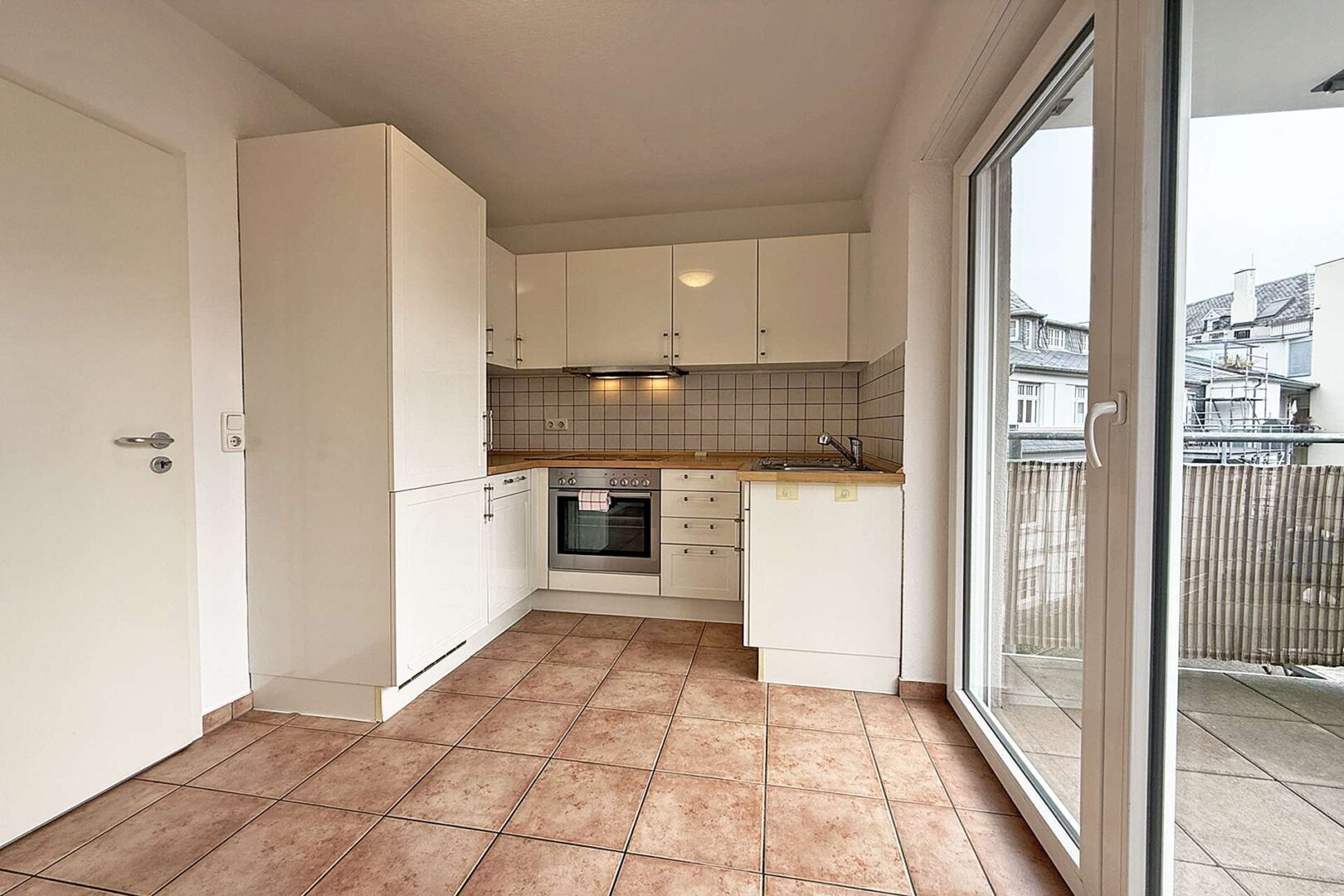 Die angrenzende Küche ist mit Einbaumöbeln und Elektrogeräten ausgestattet und verfügt ebenfalls über einen Zugang zu einem zweiten Balkon mit östlicher Ausrichtung.