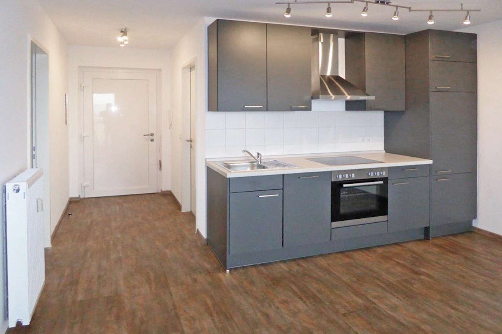 Eine moderne Küchenzeile in Grau ist in ebenfalls in diesen Raum integriert und inklusive Elektrogeräten im Kaufpreis enthalten.