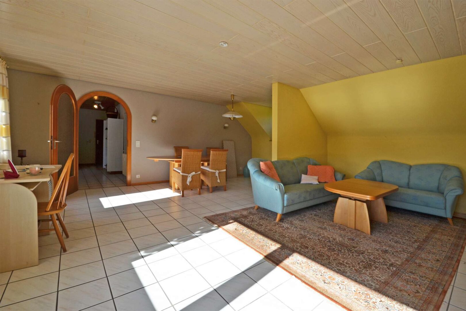 Der angrenzende Wohnbereich bietet ausreichend Platz für eine große Sofalandschaft mit TV-Ecke, einen Esstisch für mehrere Personen sowie weitere Möbelstücke.