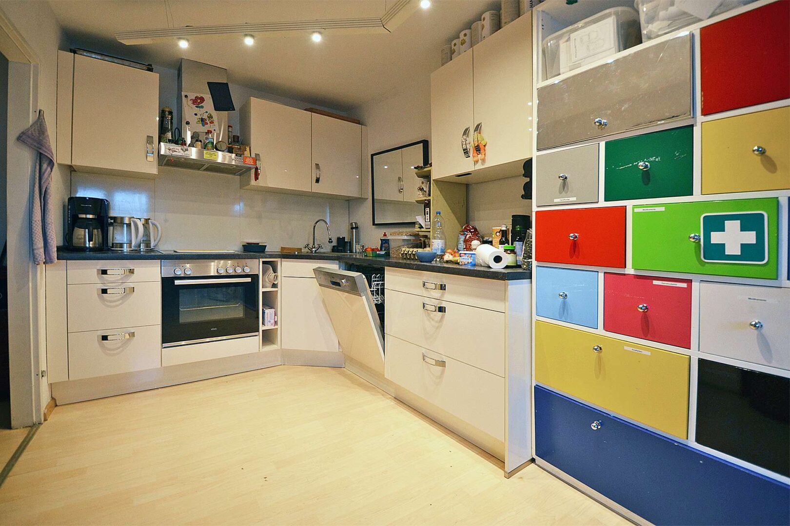 Links vom Eingangsbereich befindet sich die Küche mit modernen, weißen Einbaumöbeln, die bereits im Kaufpreis enthalten sind. Auch eine kleine Essecke lässt sich hier problemlos integrieren. Gegenüber liegt das gut proportionierte Schlafzimmer, das Raum für ein Doppelbett, einen großen Kleiderschrank und weitere Kommoden bietet.