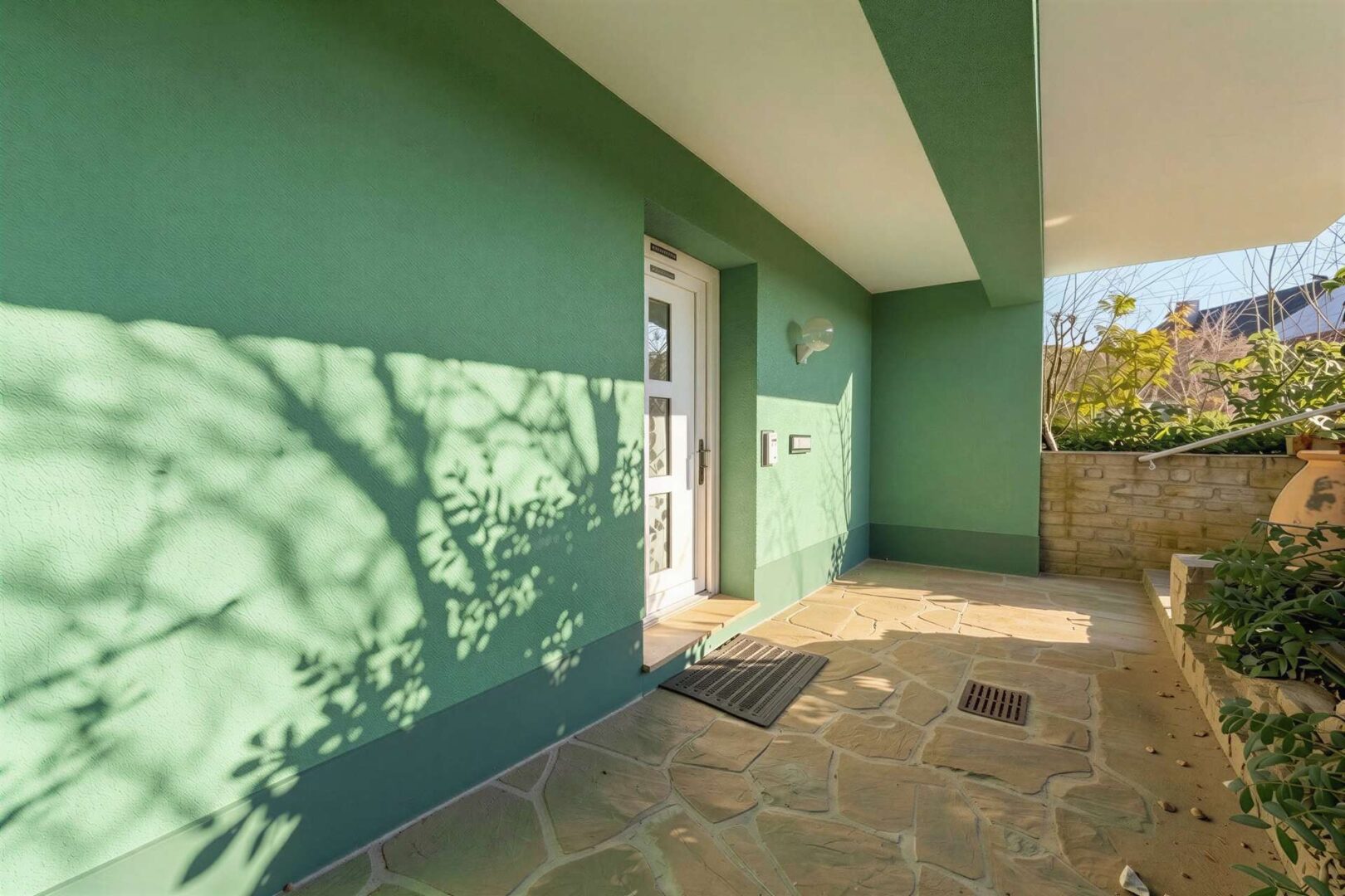 Über einen gepflasterten Weg gelangen Sie über drei Stufen zum Untergeschoss und somit zum Haupteingang des Gebäudes.