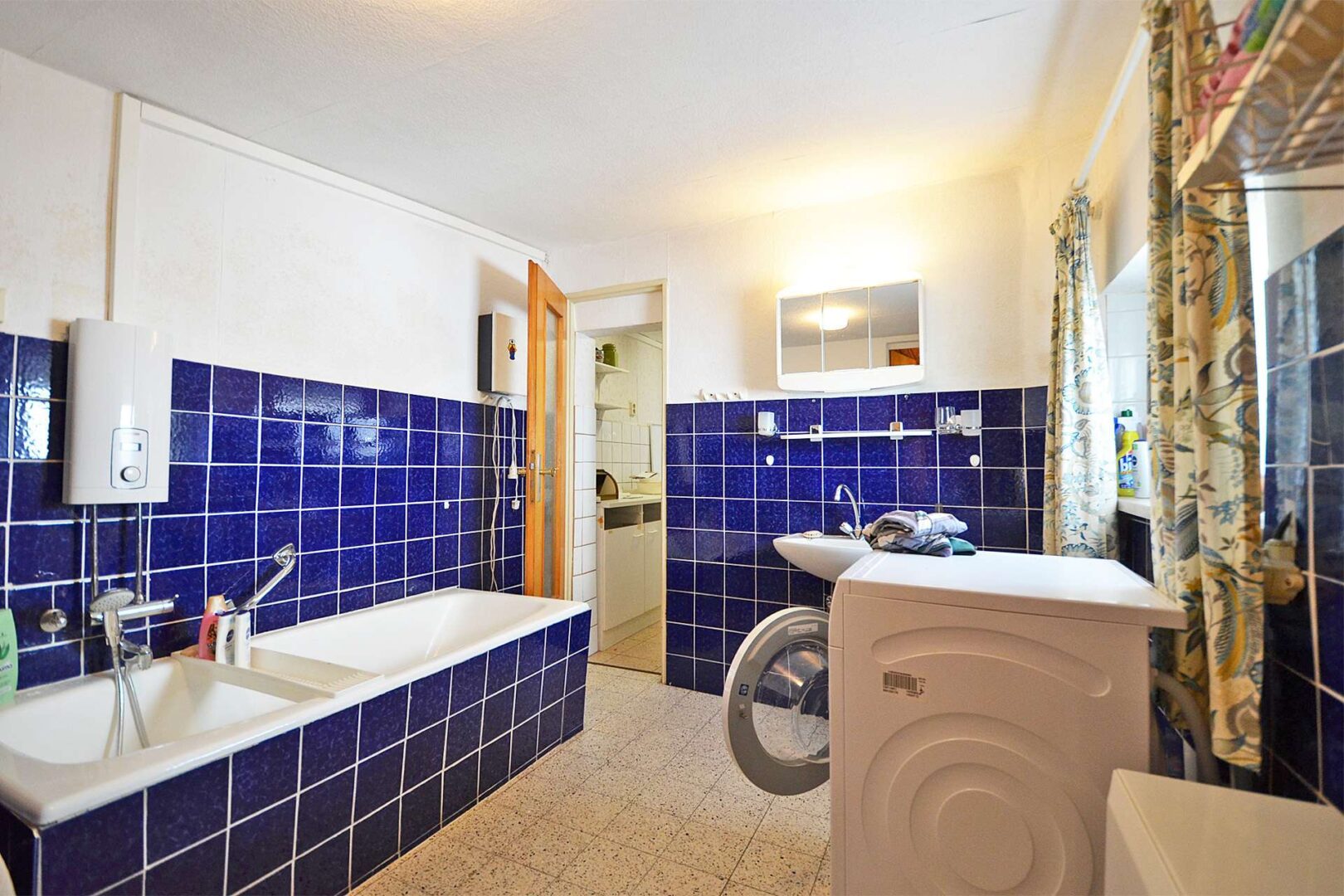 Ebenfalls vom Flur aus erreichen Sie die kompakte Küche, die in das großzügige Tageslichtbad mit Wanne, Waschtisch und Waschmaschinenanschluss übergeht. Ein praktischer Abstellraum sowie ein separates WC ergänzen das Raumangebot im Erdgeschoss.