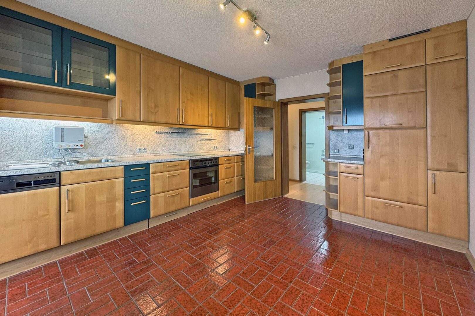 Alle Räume sind über den zentralen Flur gut erreichbar. Die Wohnküche mit ca. 15 m² Fläche bildet das Zentrum der Wohnung und verfügt über direkten Zugang zum westlich ausgerichteten Balkon, der dank Markise angenehme Nachmittags- und Abendsonne bietet. Die vorhandene, massive Einbauküche nebst Elektrogeräten ist im Kaufpreis der Wohnung enthalten. Sie ist optisch etwas in die Jahre gekommen, aber sehr gepflegt und in einem guten Zustand.