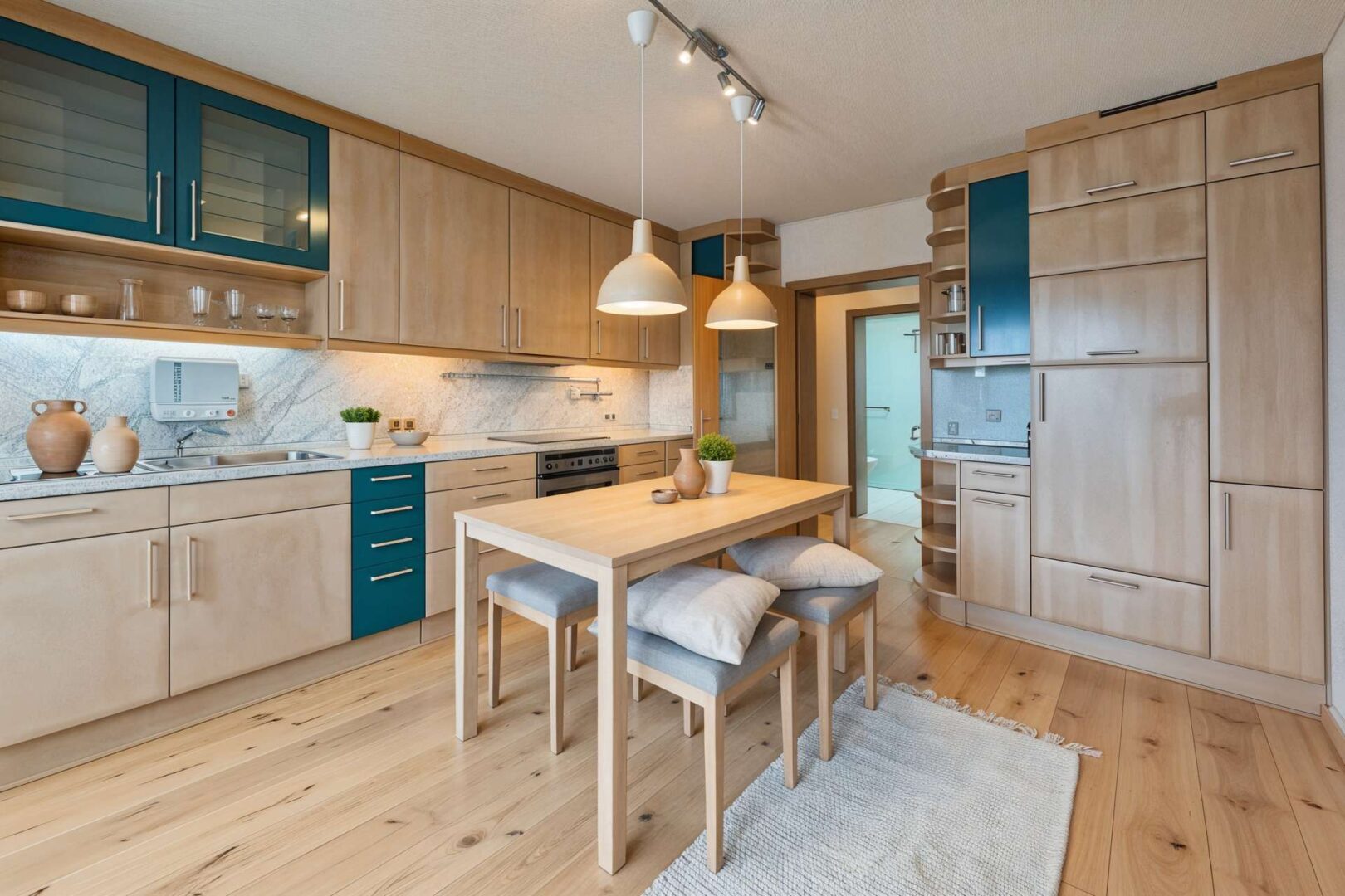 Ein praktischer kleiner Abstellraum, zentral im Flur gelegen, bietet Platz für Staubsauger und Vorräte. Er wird durch einen Einbauschrank am Ende des Flures zudem ideal ergänzt, der weiteren Stauraum bietet.