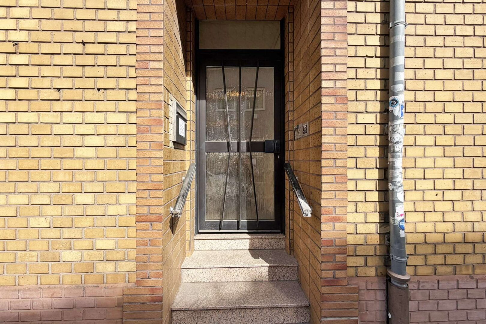 Vor dem Haupteingang des Gebäudes stehend erreichen Sie über vier Stufen das Erdgeschoss des Hauses.
