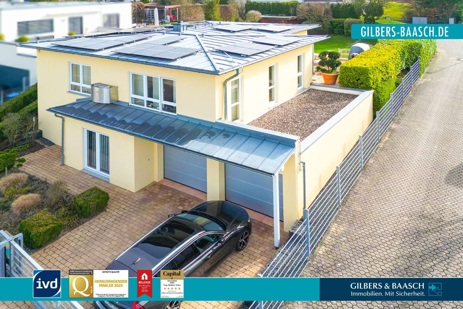 Schon beim Ankommen überzeugt diese Immobilie mit einem durchdachten und komfortablen Zugang. Sie erreichen das Haus bequem trockenen Fußes, parken Ihr Fahrzeug in der großzügigen Doppelgarage und gelangen von dort aus direkt in die Immobilie – alternativ führt Sie die stilvoll angelegte Außenanlage hinauf zum repräsentativen Haupteingang.