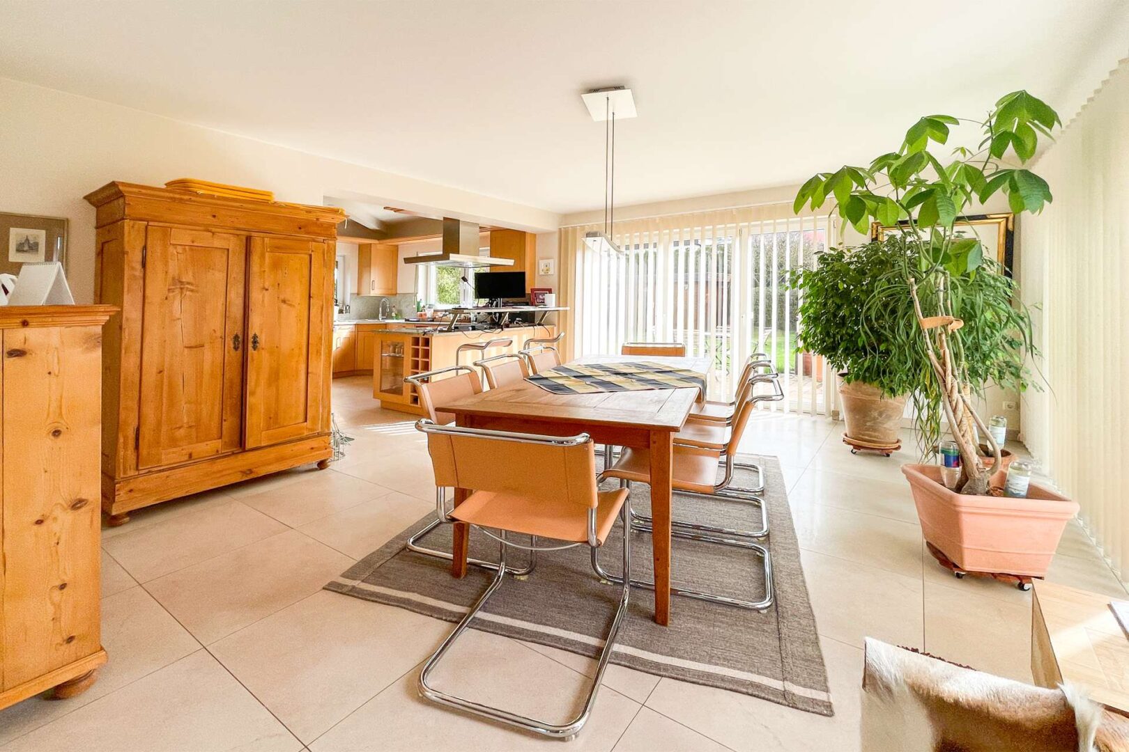 Vom Wohnbereich aus haben Sie direkten Zugang zur weitläufigen Sonnenterrasse sowie in den liebevoll angelegten Garten – ein perfekter Ort für entspannte Stunden im Freien und gesellige Abende bei schönem Wetter.