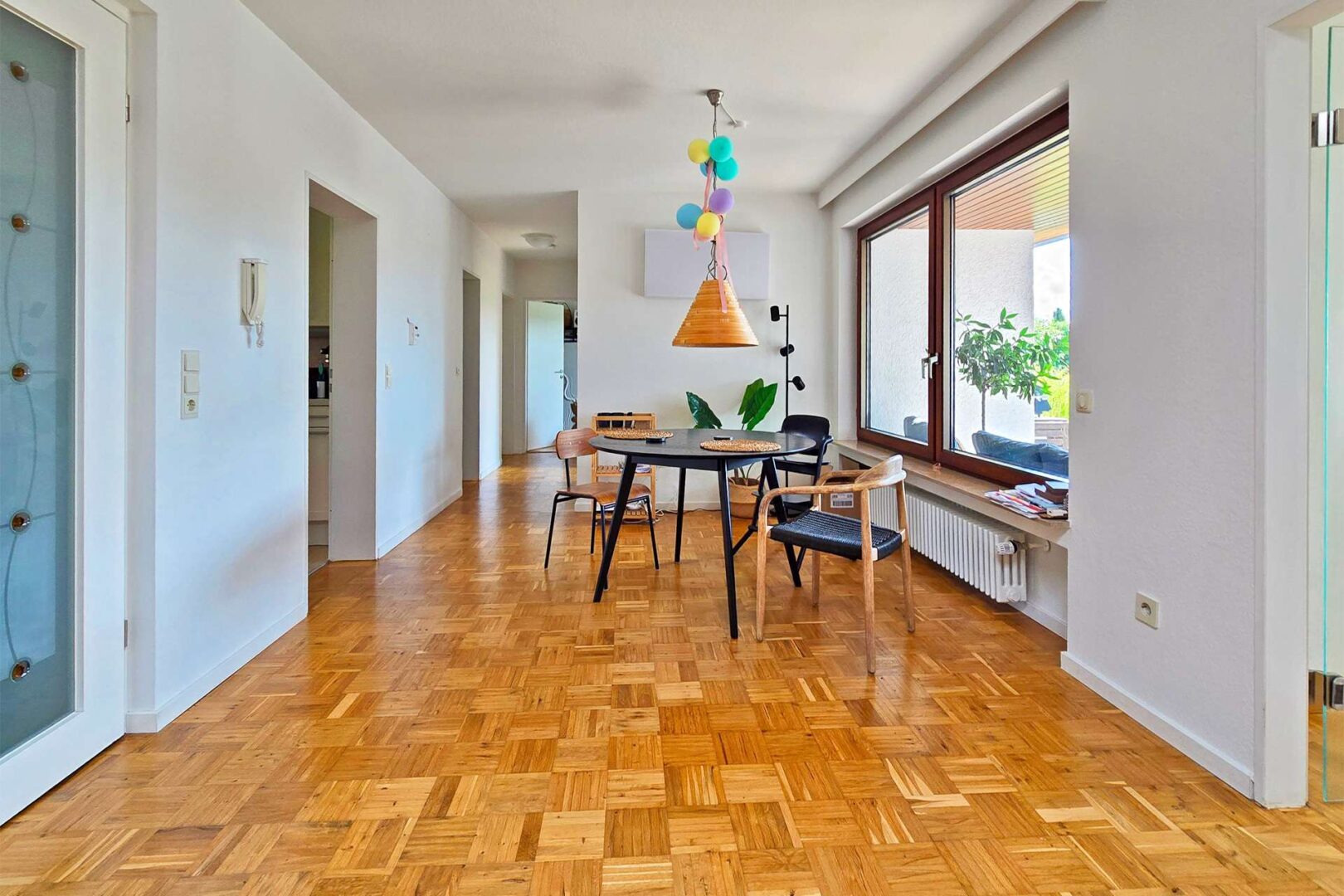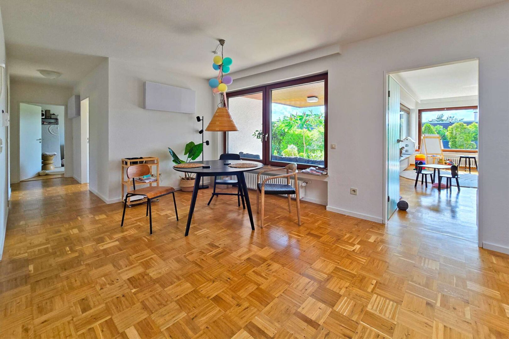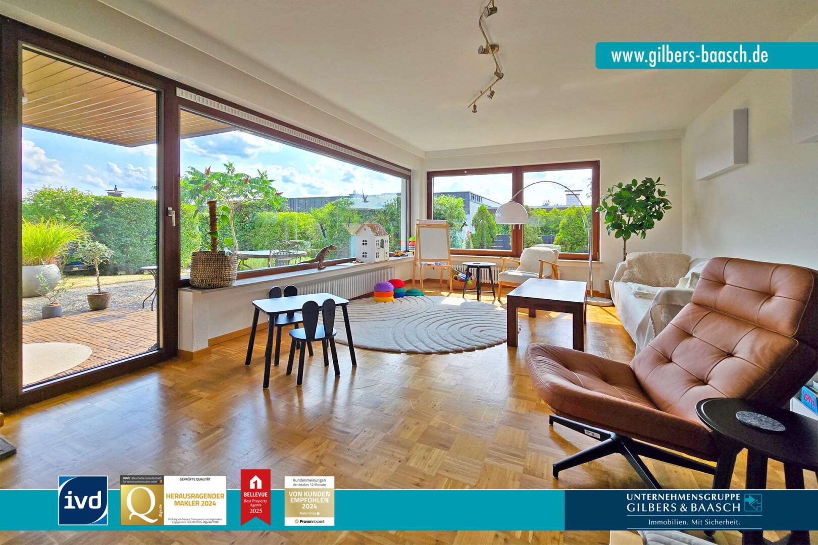 Der etwa 50 Quadratmeter große Wohn- und Essbereich ist vom Flur aus zugänglich und bildet das Zentrum des Hauses. Großzügige Fensterflächen öffnen den Blick in den Garten und lassen viel Tageslicht in den Raum. Ein zusätzliches Oberlicht sorgt für eine angenehme Grundhelligkeit, auch an weniger sonnigen Tagen. Der Essbereich bietet ausreichend Platz für gesellige Runden, während sich der angrenzende Wohnbereich ideal für eine gemütliche Sofaecke eignet.