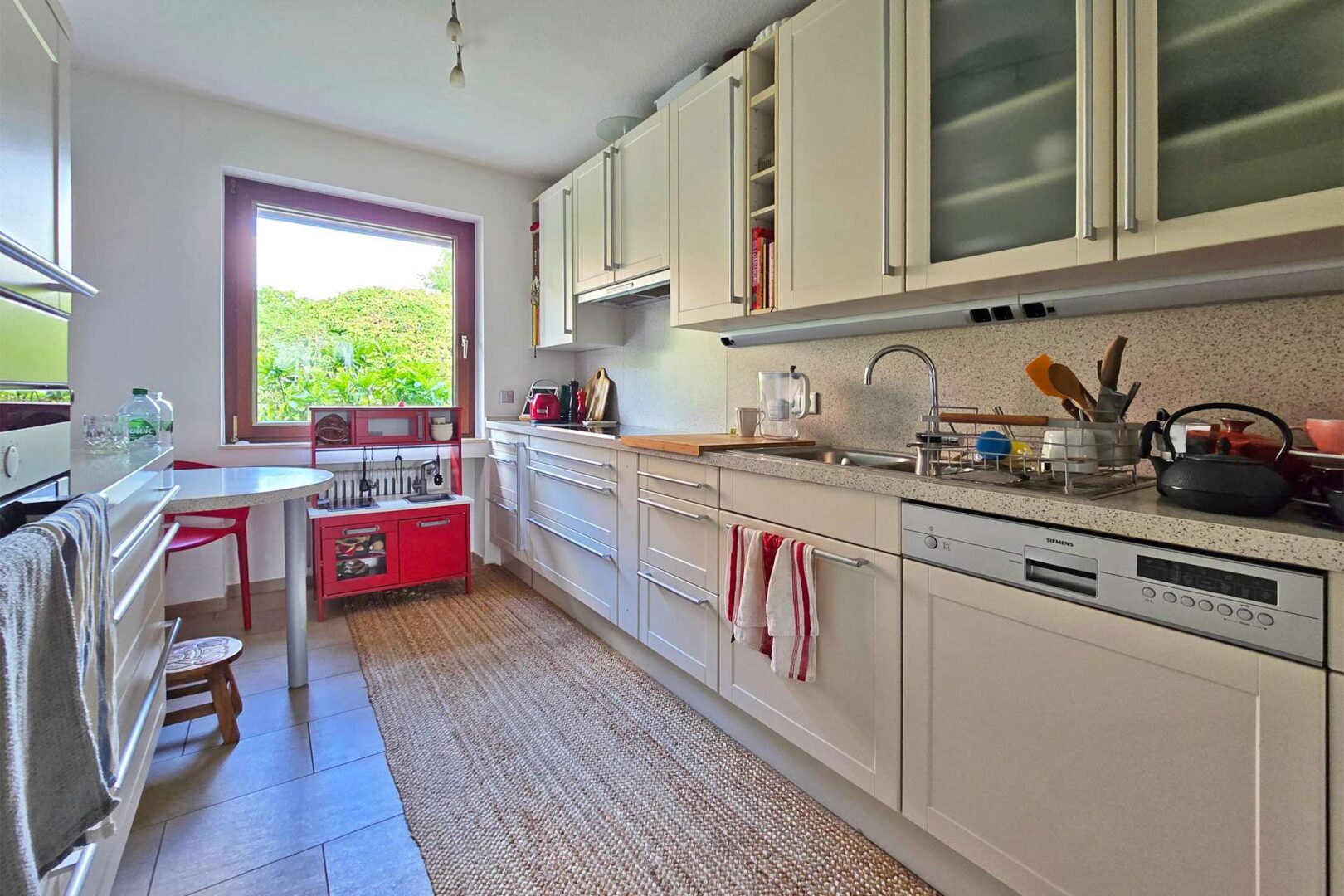 Die separate Küche ist vollständig ausgestattet, verfügt über ein großes Fenster und bietet viel Stauraum. Ihre Nähe zum Essbereich sorgt für kurze Wege und gute Abläufe im Alltag.