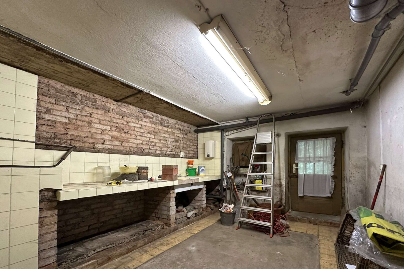 Zurück in den jeweiligen Eingangsbereichen der Immobilien finden Sie jeweils einen separaten Kellerzugang. Der Keller der linken Gebäudehälfte verfügt über einen Lagerraum, einen Durchgangsraum mit Heizöltank sowie den Heizungsraum. Hier finden Sie die zentrale Ölheizung, welche beide Gebäude beheizt. Aus dem Durchgangsraum gelangen Sie außerdem in den Garten. Der Keller der rechten Gebäudehälfte verfügt über zwei weitere Lagerräume und eine Waschküche. Aus der Waschküche finden Sie einen weiteren Zugang in den Garten und zu Ihrer überdachten Terrasse auf Gartenebene.