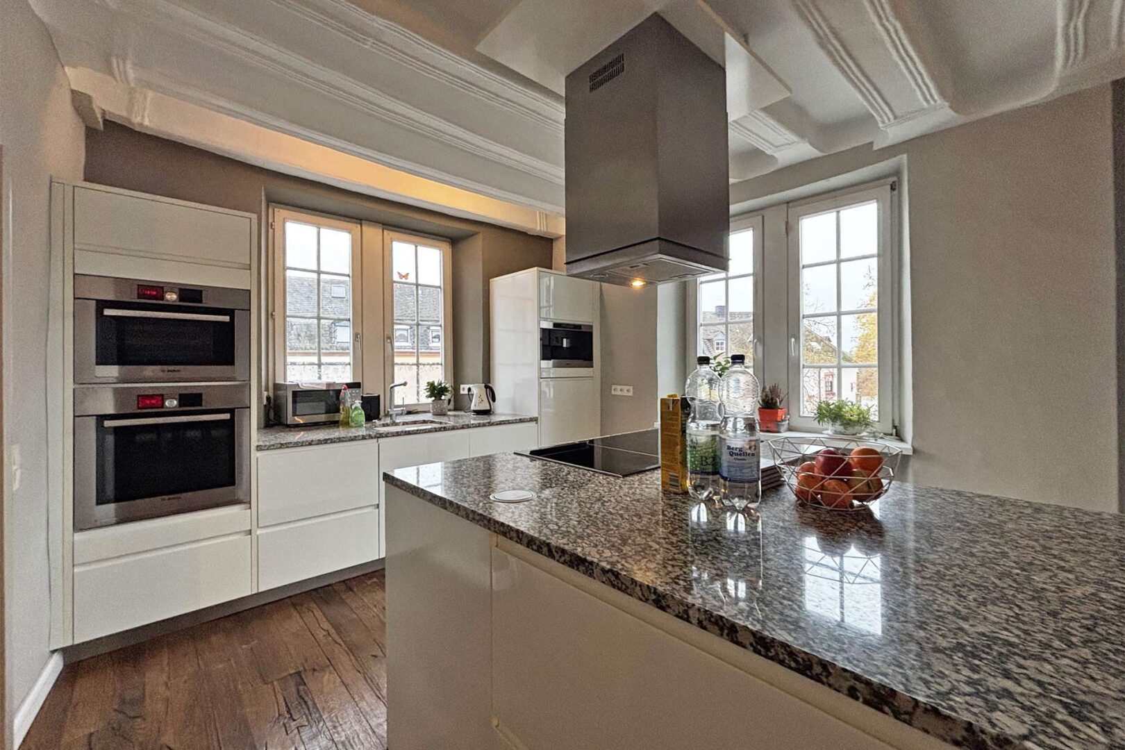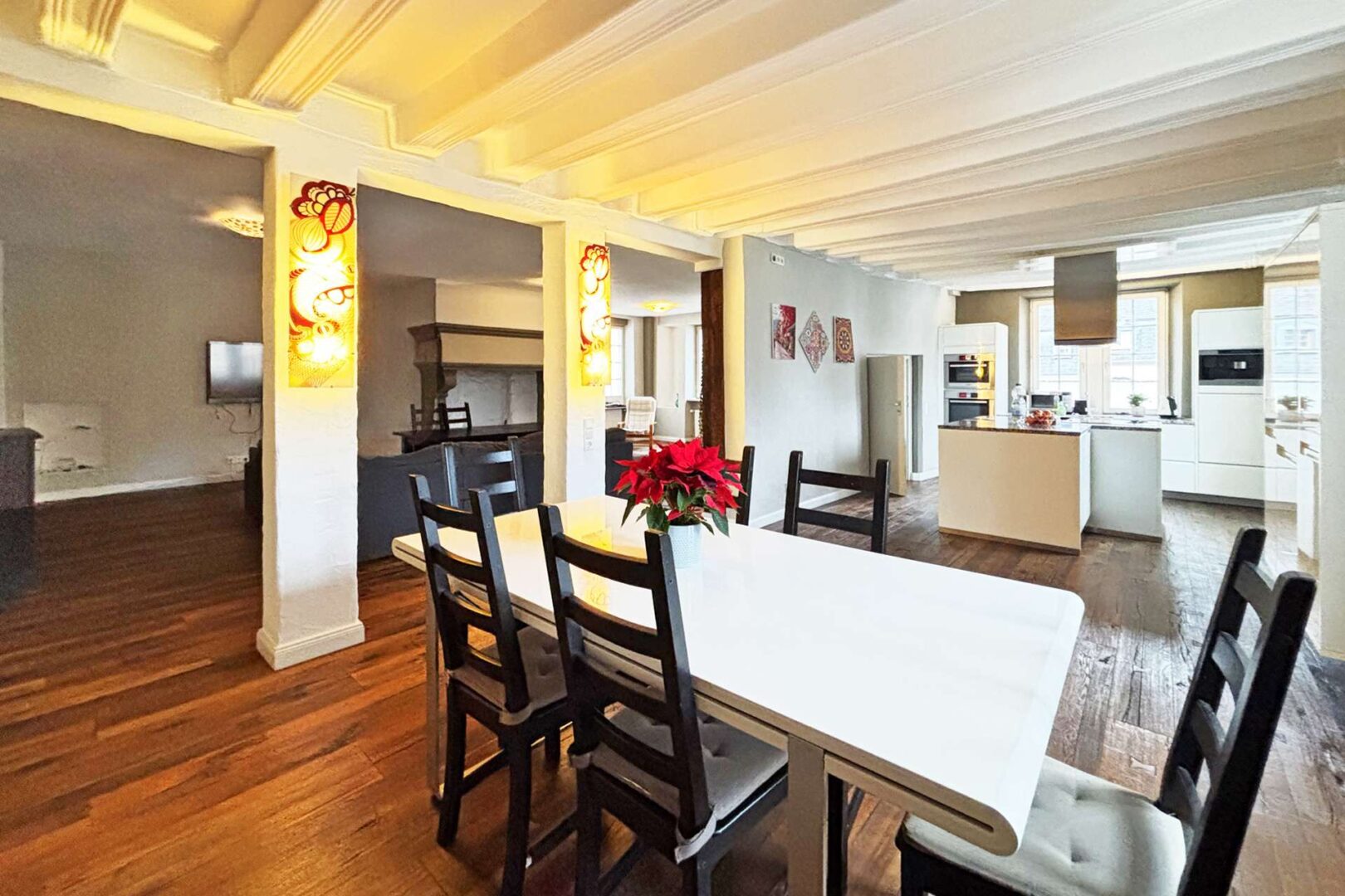 Hier überzeugen der großzügige Wohn-/Koch- und Essbereich mit toller Wohlfühlatmosphäre. Der denkmalgeschützte Renaissance-Kamin, die sogenannte Kölner Decke und die topmoderne Einbauküche aus 2012 sorgen für das richtige Ambiente.