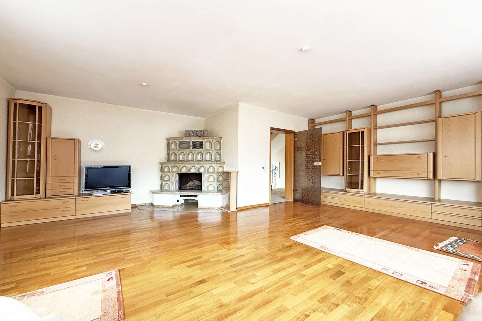 Über eine massive Steintreppe gelangen Sie in das Erdgeschoss, das den zentralen Wohnbereich bildet. Hier erwartet Sie ein großzügiges, lichtdurchflutetes Wohnzimmer mit hochwertigem Echtholzparkett und einem gemütlichen Kachelofen. Von hier aus haben Sie Zugang zum Balkon in Ost-Ausrichtung mit elektrisch gesteuerter Markise und einem weitläufigen Blick über das Ruwertal.