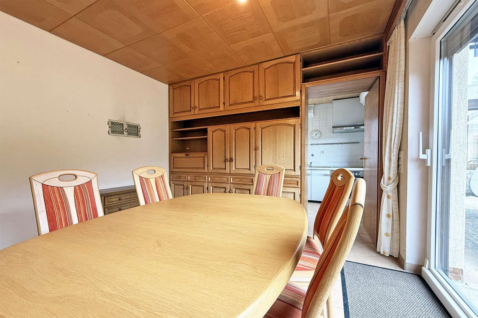 Gegenüber befindet sich der Essbereich mit Zugang zur Küche sowie zur Terrasse und dem Garten. Auch hier wurde eine Markise mit elektrischer Steuerung zur Beschattung installiert. Die derzeitige Trennung zwischen Küche und Essbereich erfolgt über einen praktischen Schrank mit Durchreiche, der bei Bedarf entfernt werden kann, um einen offenen Koch- und Essbereich zu schaffen.
