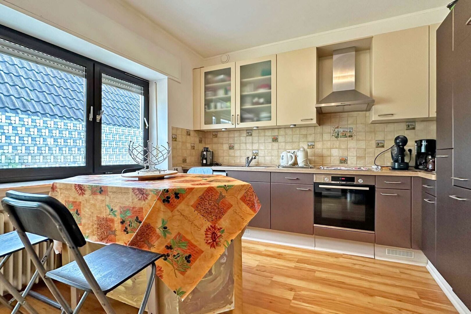 Angrenzend betreten Sie die ca. 14 m² große Küche mit Platz für einen Bartisch oder einen weiteren Esstisch.