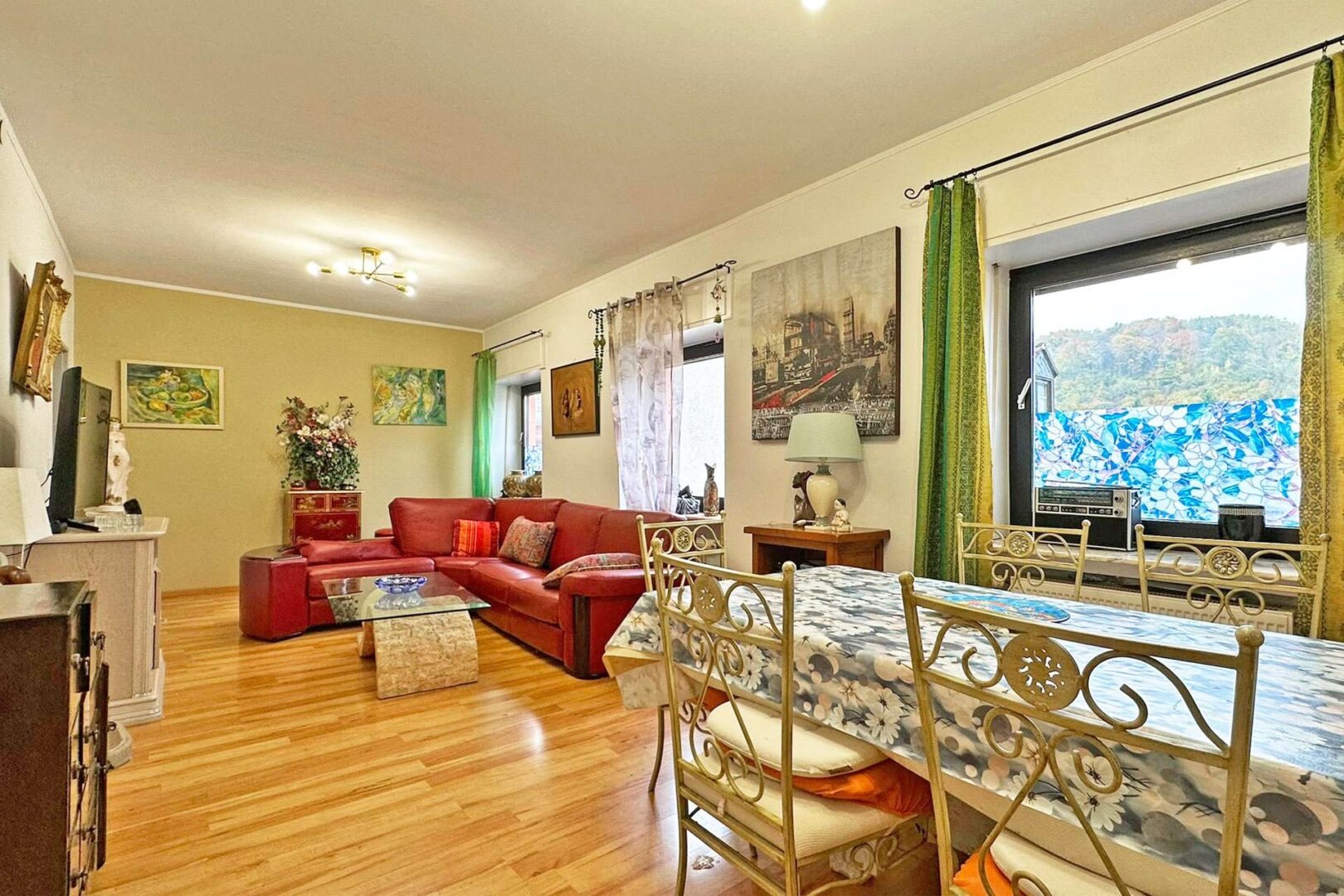 Die breite Fensterfront des Raumes sorgt für viel Tageslicht und schafft eine einladende Wohnatmosphäre.