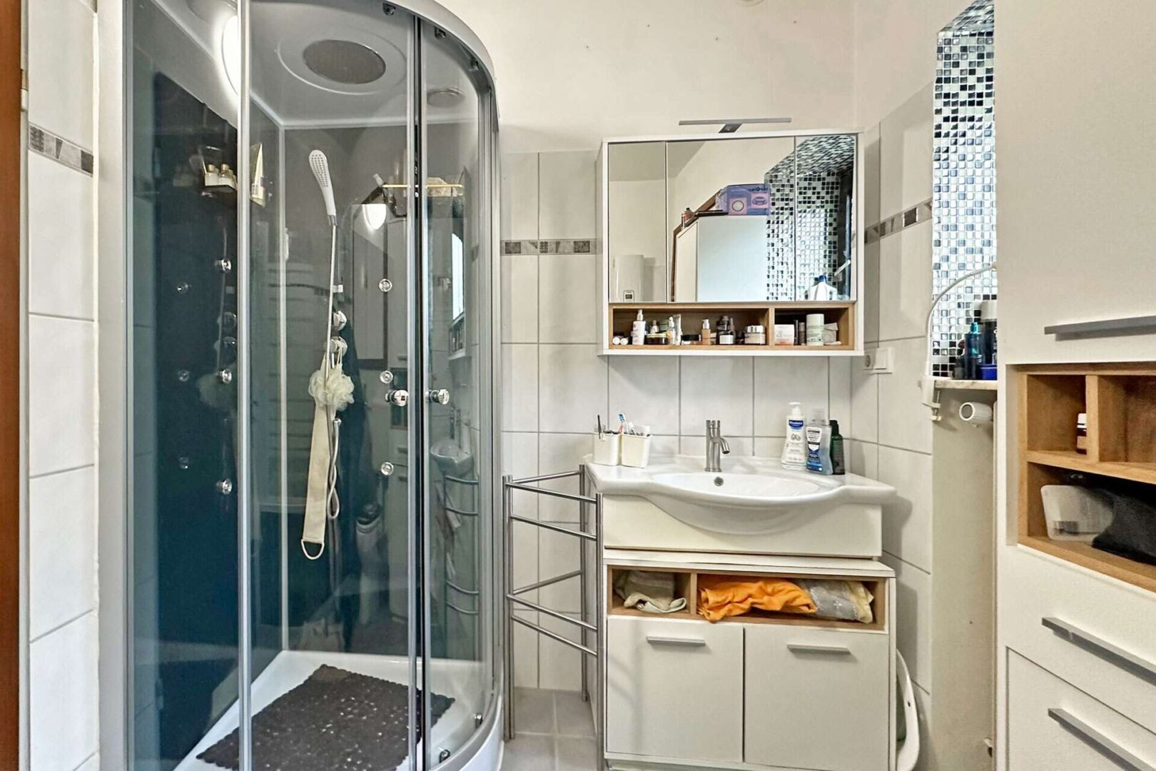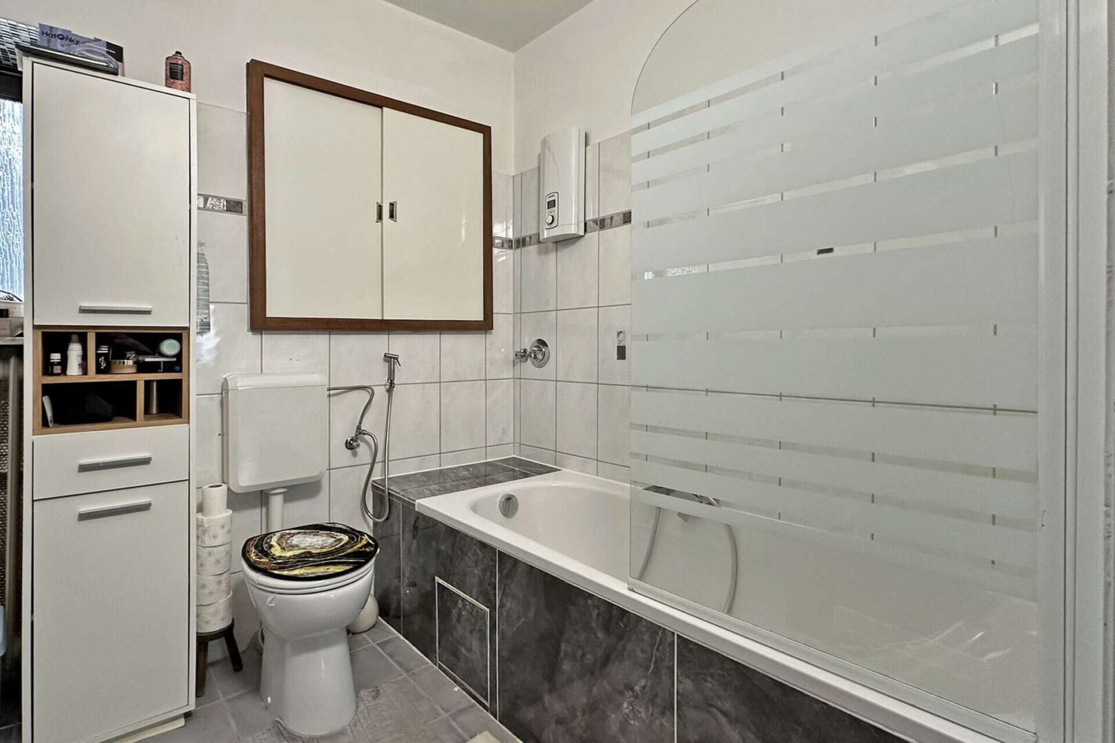 Das Badezimmer ist ausgestattet mit einem WC, einer Badewanne, einer Massageduschkabine und einem Waschtisch.