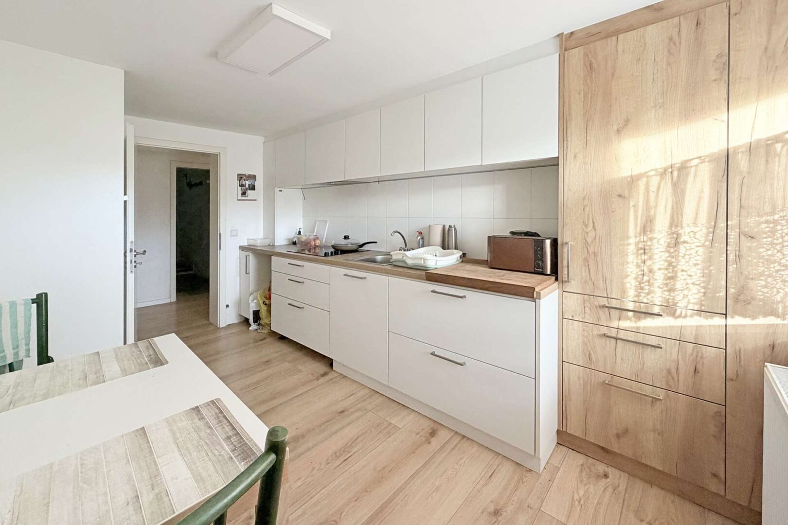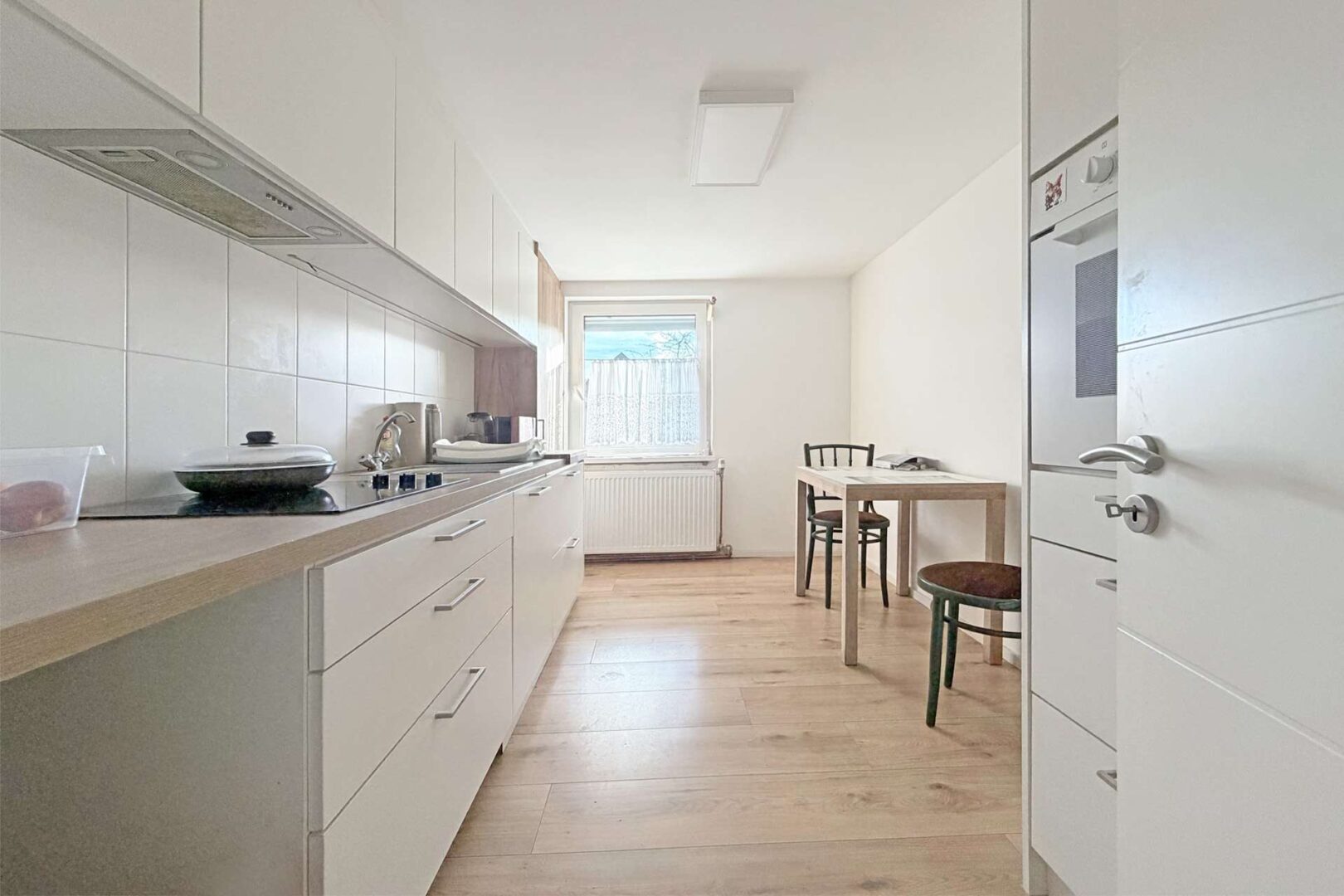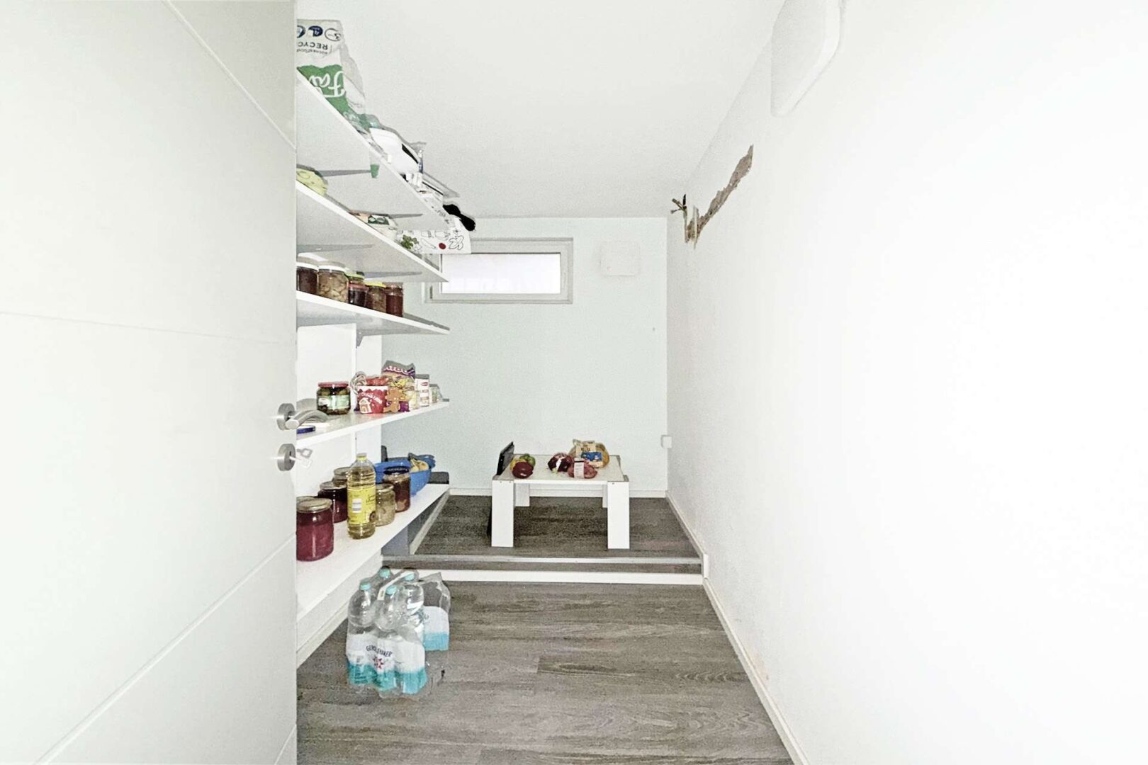 Nach links vom Flur gelangen Sie in die große Küche, die mit diversen Elektrogeräten ausgestattet ist. Ein kleiner Abstellraum, der früher als Verbindung zur oberen Einheit diente, bietet zusätzlichen Stauraum. Die Treppe nach oben ist noch vorhanden, der Zugang wurde jedoch bereits verschlossen.