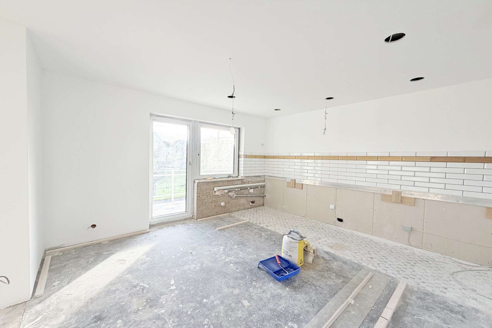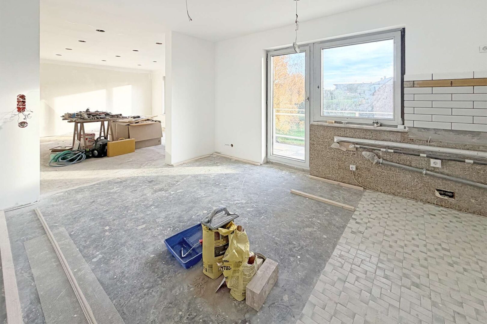 Dort erwartet Sie eine durchdachte Raumaufteilung. Das Herzstück des Obergeschosses bildet der großzügige Wohnbereich mit direktem Zugang zur offenen Küche. Der Raum ist lichtdurchflutet und bietet viel Platz, um einen gemütlichen Rückzugsort nach eigenen Vorstellungen zu gestalten. Das angrenzende große Schlafzimmer verfügt über einen separaten Bereich, ideal als Ankleide. Zwei weitere Zimmer bieten flexible Nutzungsmöglichkeiten und runden das Platzangebot perfekt ab. Das Badezimmer ist bereits mit einer Badewanne ausgestattet. Gegenüber befindet sich der ehemalige Zugang zur unteren Einheit, der als Gäste-WC vorgesehen ist; die Wasseranschlüsse sind bereits vorhanden.
